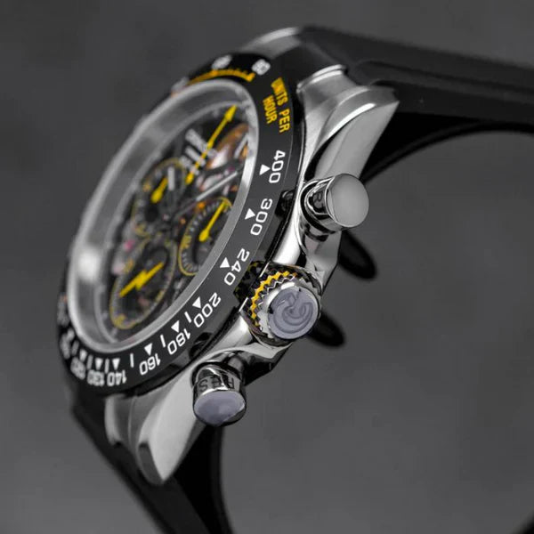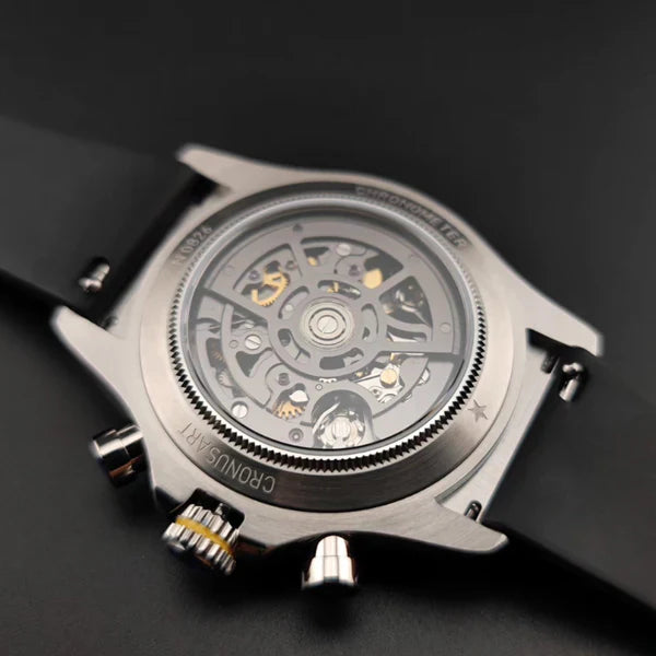 Le CRONUS ART CM015-009 représente l'innovation horlogère à travers sa série Daytona, fusionnant le design classique de la Rolex Daytona avec des influences mondiales modernes. L'ajout de la fonctionnalité d'odometre, permettant de mesurer des vitesses jusqu'à 400 unités par heure, en fait bien plus qu'une montre – c'est un outil de précision pour les passionnés de sports et de courses.