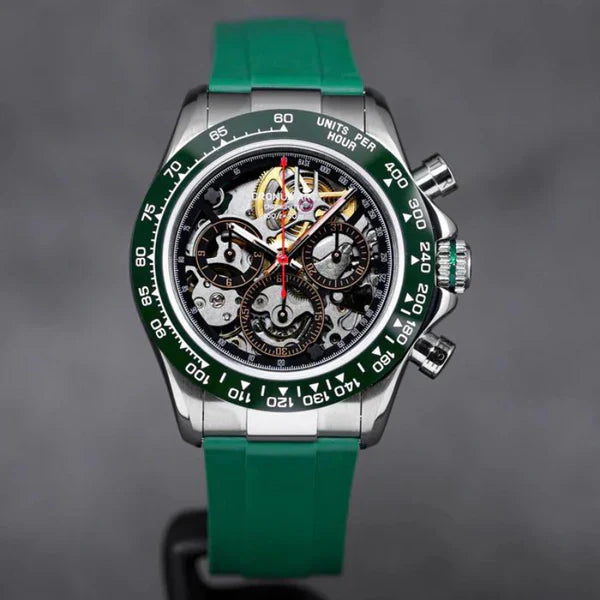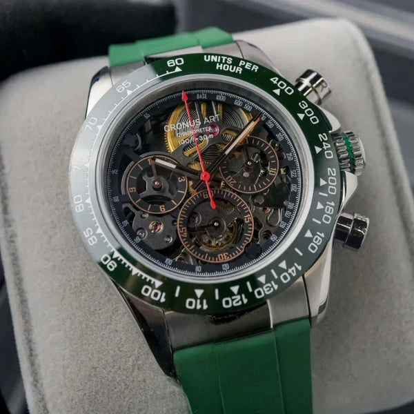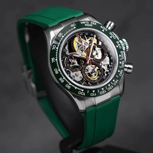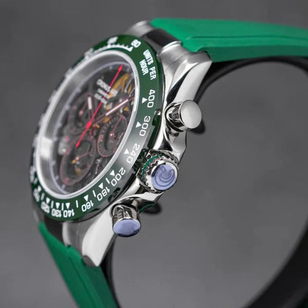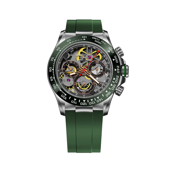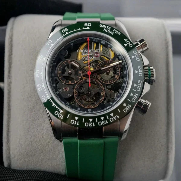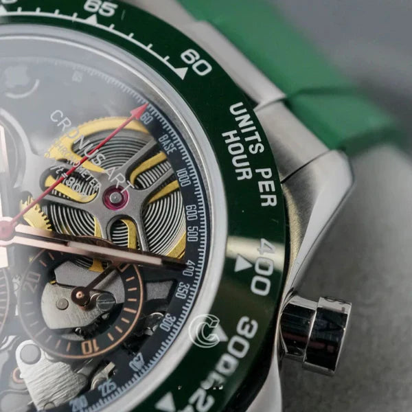 Le CRONUS ART CM015-010 incarne l'innovation en horlogerie avec sa série Daytona, qui fusionne élégance classique et influences mondiales. L'ajout de la fonctionnalité d'odometre avancée pour mesurer les vitesses jusqu'à 400 unités par heure en fait bien plus qu'une simple montre, la transformant en un outil essentiel pour les amateurs de sports et de courses.