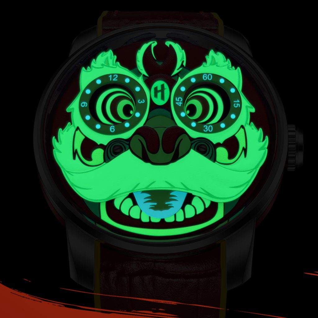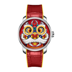 La montre Lion Red de Lucky Harvey incarne la puissance et la symbolique du lion, associée à un design lumineux et distinctif. Avec son cadran inspiré de la danse du lion, ses yeux mobiles ajoutent une touche d’animation intrigante, offrant une expérience visuelle captivante. Ce modèle automatique est doté d’un mouvement de qualité manifacture, assurant une précision et qualité. Les détails luminescents du cadran permettent une bonne lisibilité, même dans l’obscurité, ajoutant à son allure unique. Conçue pour les amateurs de montres singulières et symboliques, la Lion Green est une fusion parfaite de culture, de performance et de style. La bouche automate s'ouvre et se ferme au fur et à mesure de l'écoulement de chaque heure. Les yeux indiquent les heures et les minutes.