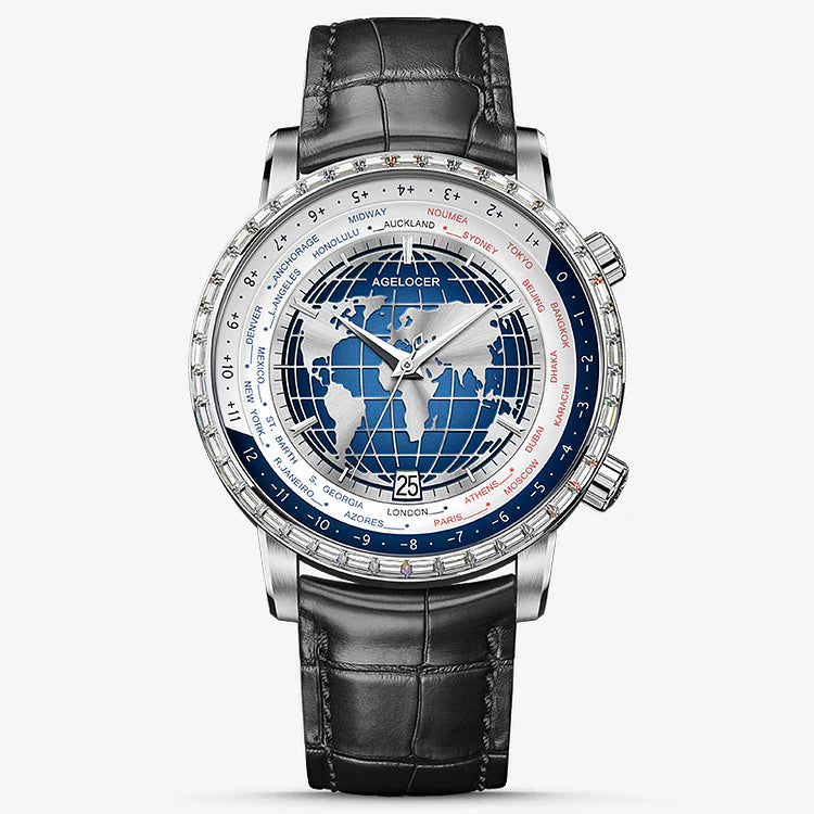 La montre Agelocer Worldtimer combine ingénieusement fonctionnalité heure mondiale et design élégant. Avec son affichage de l’heure universelle, ce modèle automatique permet de suivre facilement l’heure dans les principales villes du monde, idéal pour les voyageurs et les amateurs d’horlogerie moderne. Dotée d’un mouvement mécanique précis et d’un boîtier robuste, cette montre garantit une performance fiable et un style distinctif. Son cadran est protégé par un verre saphir résistant aux rayures, tandis que le design élégant s’adapte à toutes les occasions. Découvrez une montre qui allie fonctionnalité globale et élégance intemporelle.