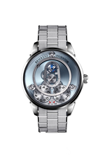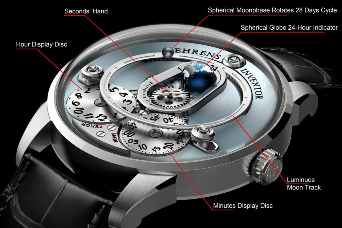 Sur le cadran, un globe en forme de dôme représentant la Terre tourne une fois toutes les 24 heures à la position 12h00, servant d’indicateur jour/nuit. À ses côtés, un petit globe représentant la Lune effectue une rotation autour de la Terre sur un cycle de 28 jours, recréant avec précision le mouvement lunaire.