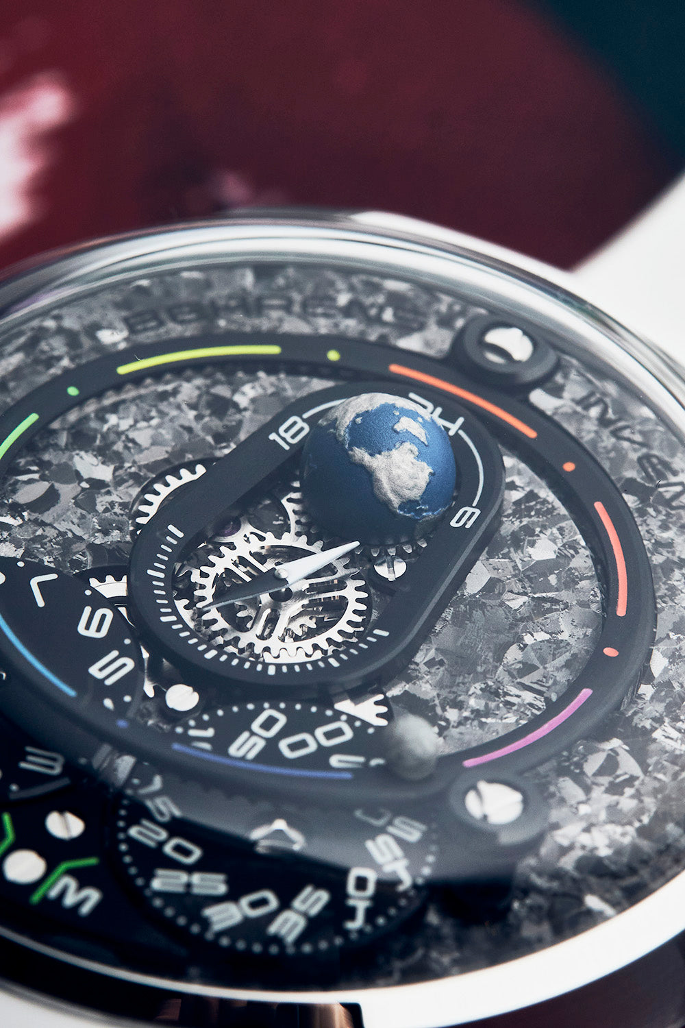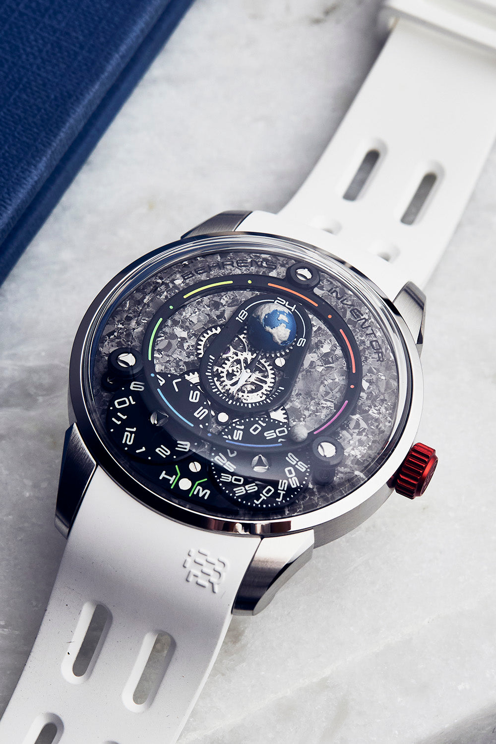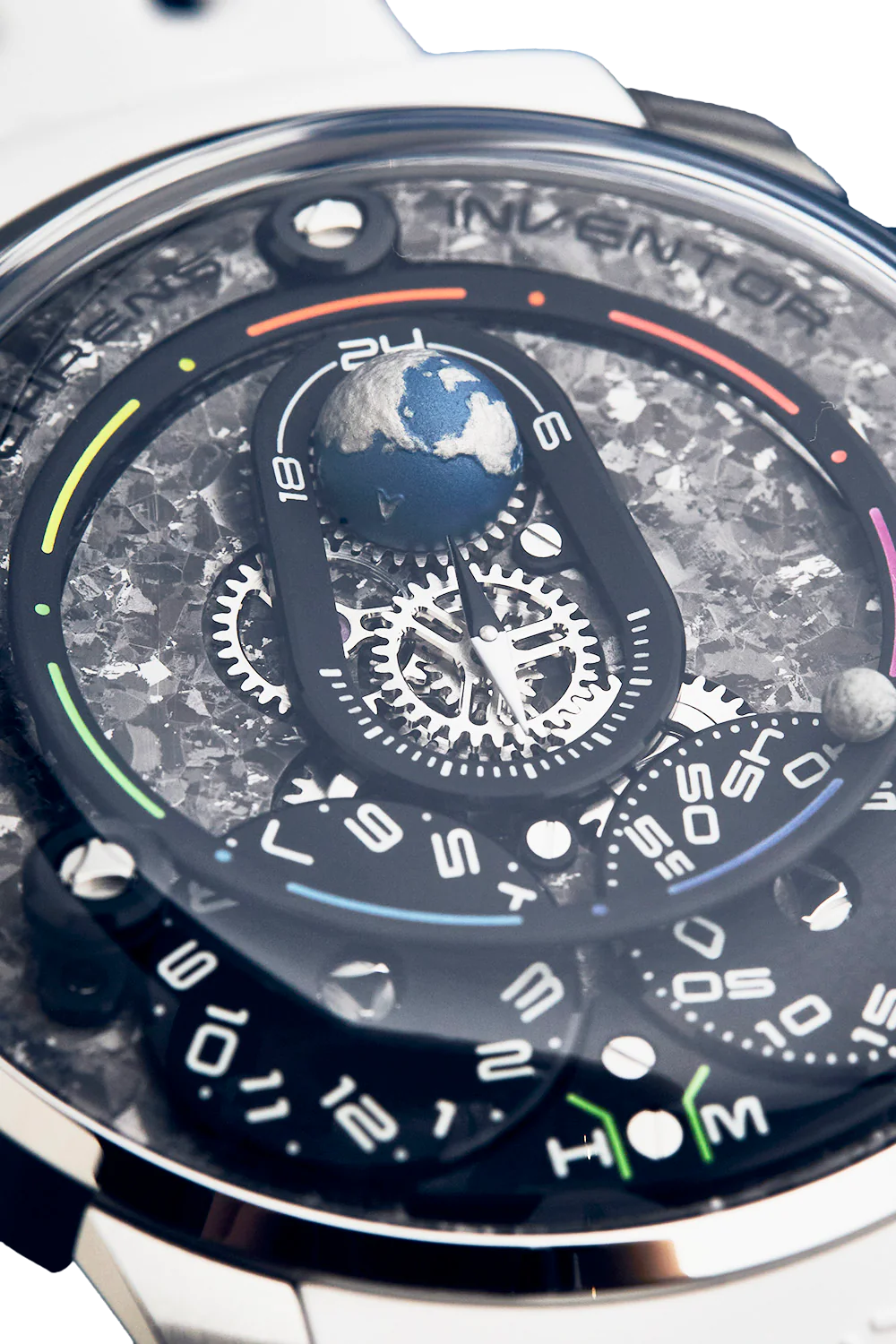 Elle est équipée d’un mouvement automatique Swiss Made ETA Cal.2824, offrant une lecture de l’heure inspirée par l’orbite entre la Terre et la Lune. À 12h00, un globe représentant la Terre effectue une rotation en 24 heures pour indiquer le cycle jour/nuit, tandis que la Lune tourne autour de la Terre en un cycle de 28 jours, offrant une vision en 3D fascinante et réaliste de l’espace.