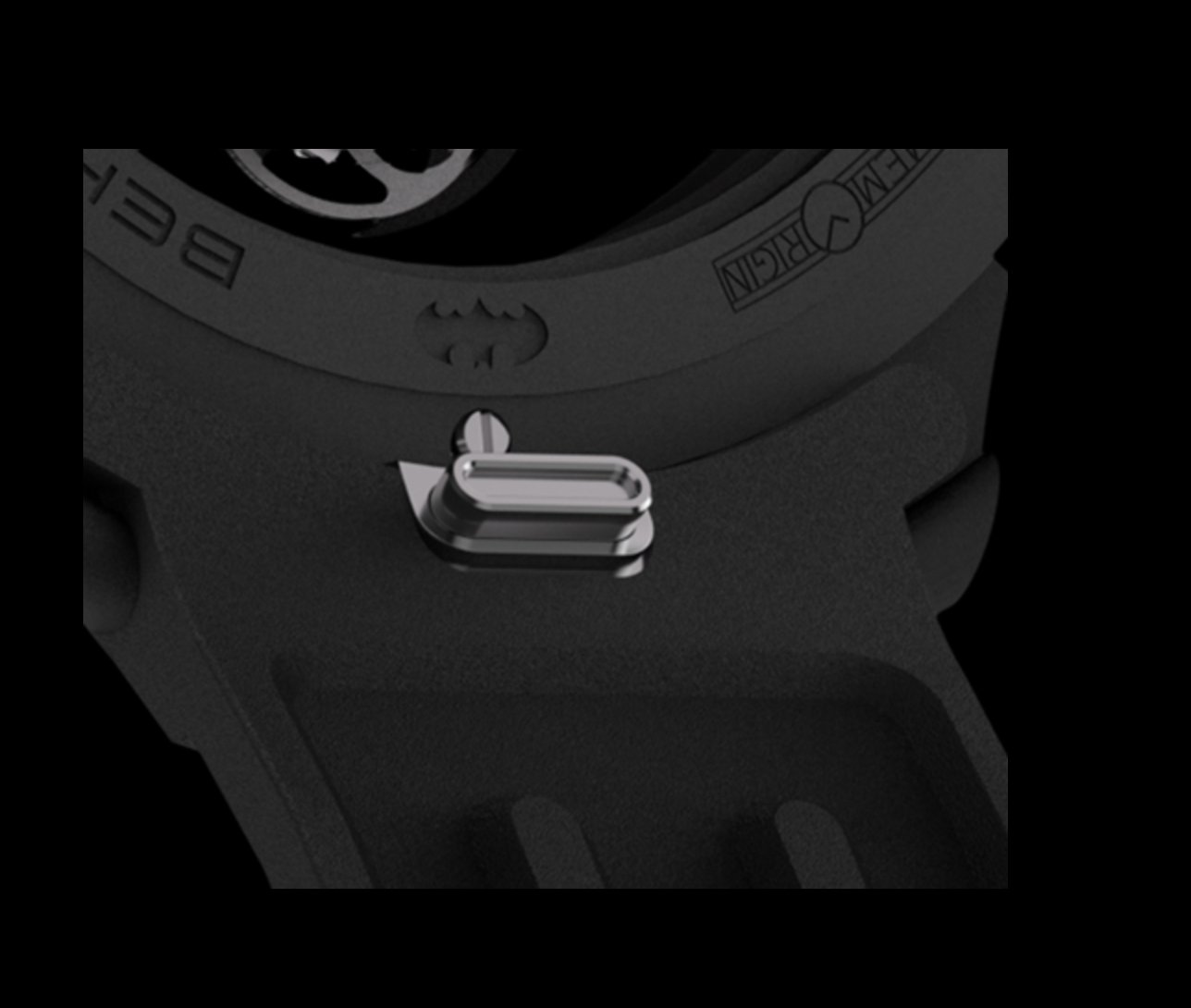 Le boîtier rond a été recouvert de noir pour correspondre au thème de Batman, avec verres saphir dessus et dessous, rendant le mouvement visible. Les cornes du boîtier sont ajourées par rajouter une touche de revêtement de surface.