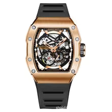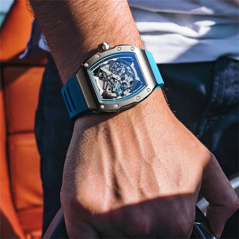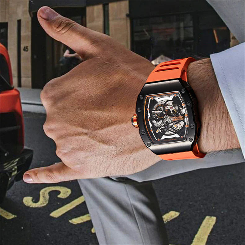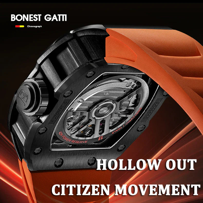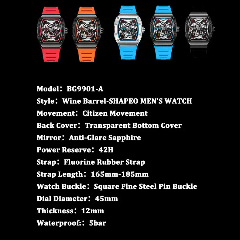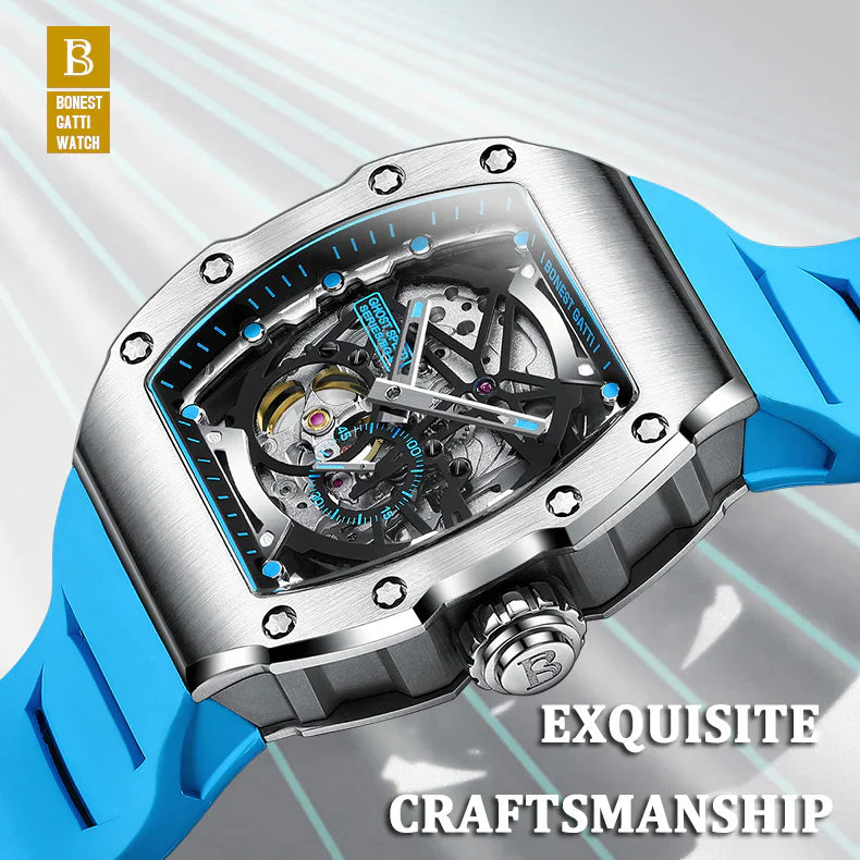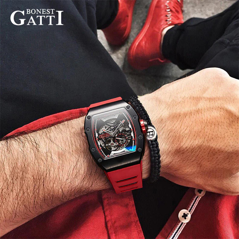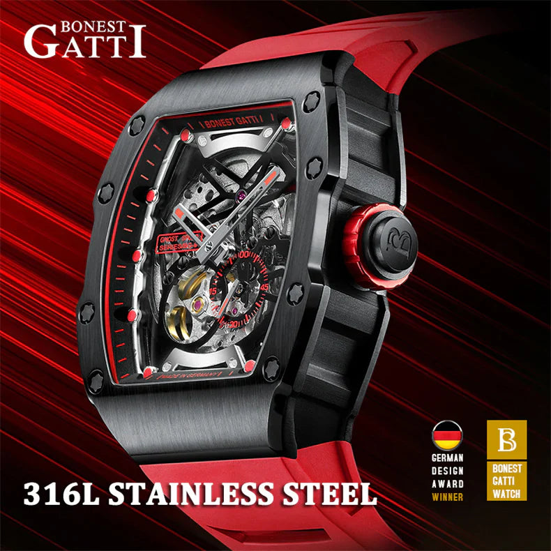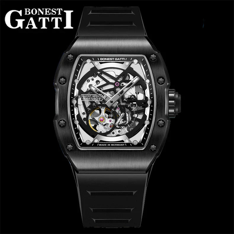 The Bonest Gatti Barrel BG9901 features a robust stainless steel case measuring 40mm in diameter and 12mm in thickness, housing a precise mechanical movement. Its durable rubber strap ensures comfort and resilience, secured with a reliable pin buckle. This timepiece combines expert craftsmanship with practical design, ideal for those who appreciate mechanical watches with a modern, sporty edge.