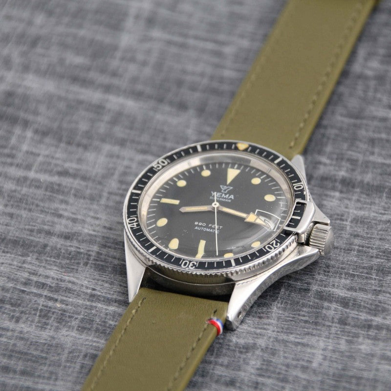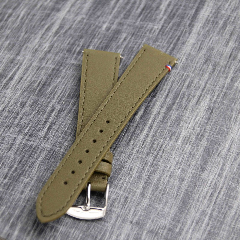 Un bracelet extra-plat, en cuir pleine fleur, doublé nubuck, au look classique intemporel et subtilement relevé de notre célèbre point de bride "bleu blanc rouge". Le SAINT BRIAC, coloris kaki, habillera aussi bien votre montre de ville que votre plongeuse préférée ! Il est équipé de pompes flash pour une installation rapide et facile!