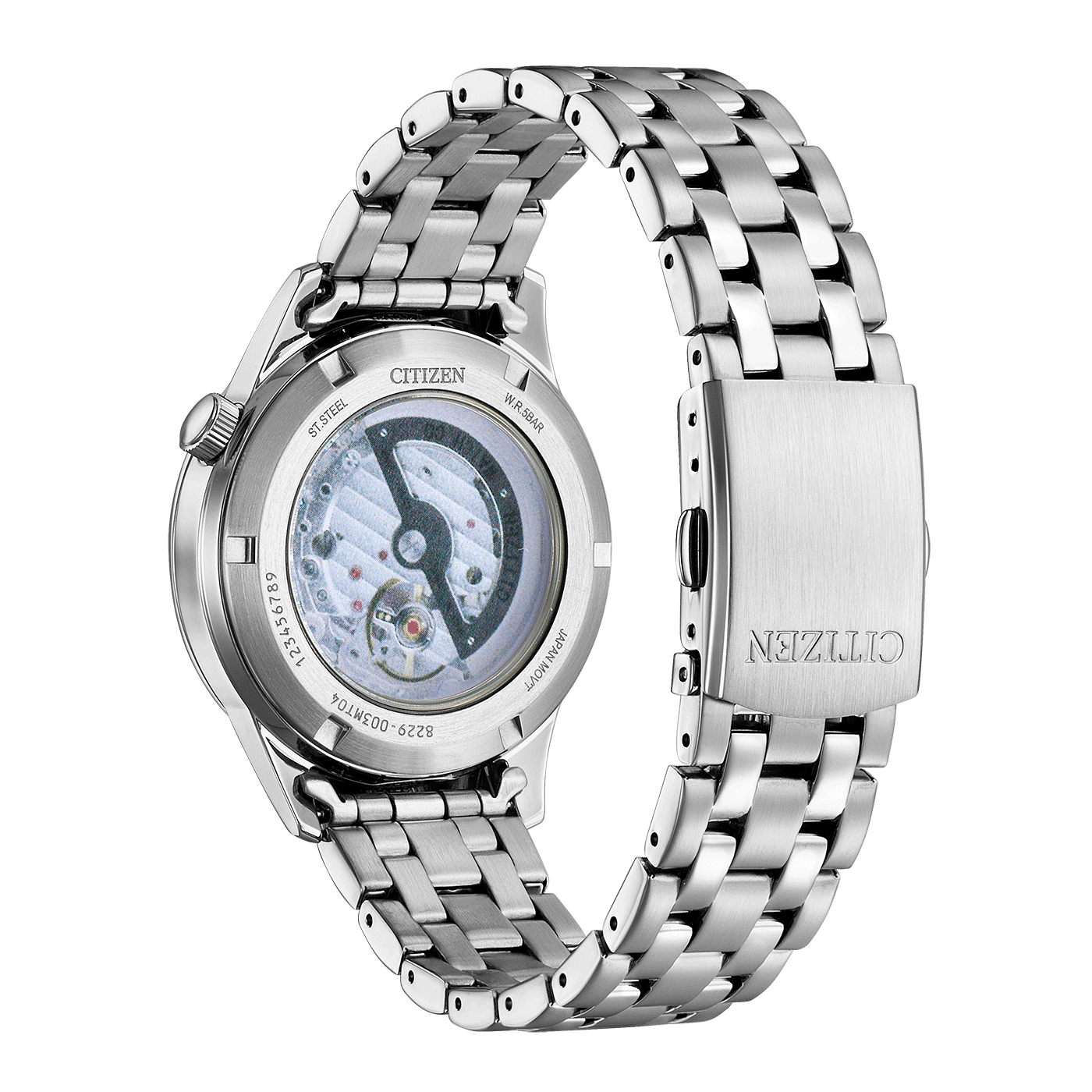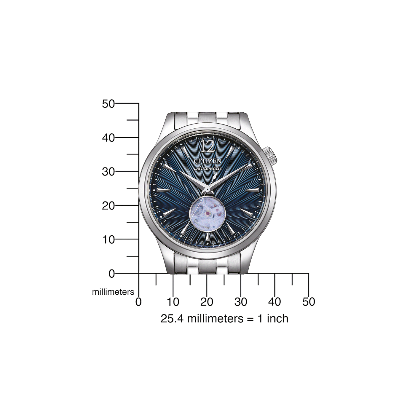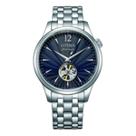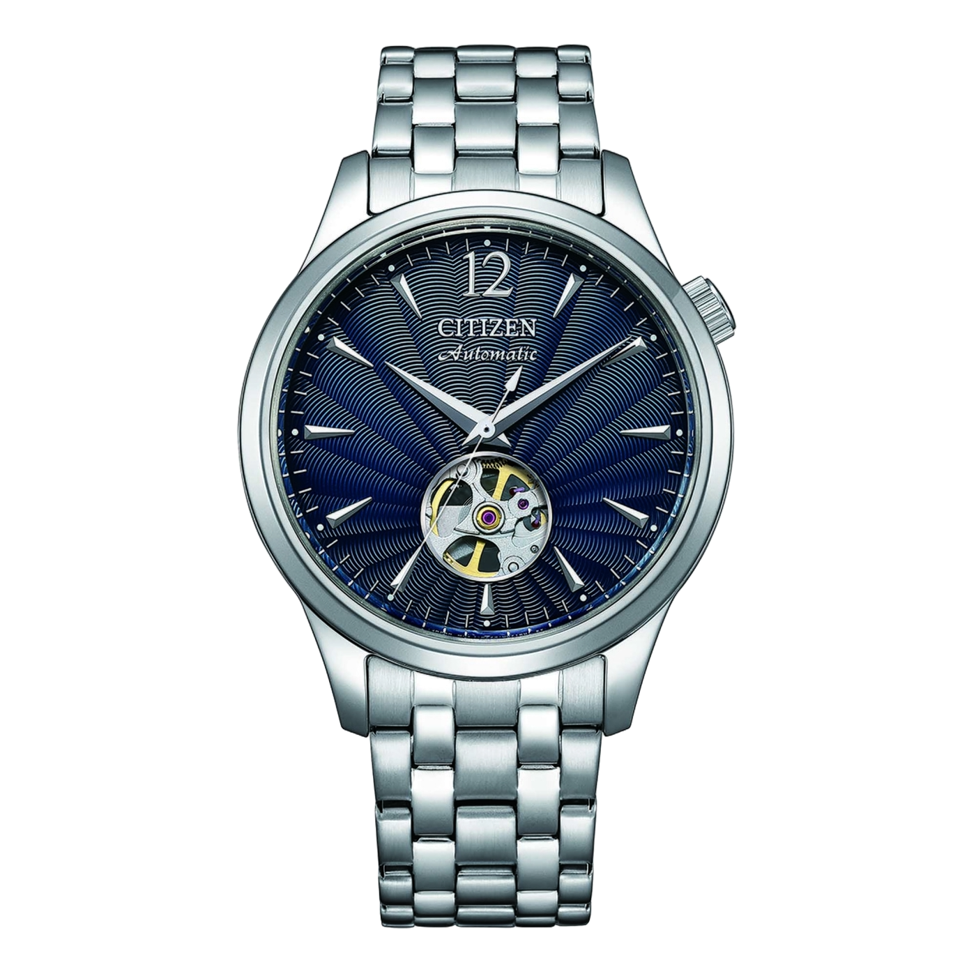 Montre automatique classique à cœur ouvert. Boîtier et bracelet en acier inoxydable, verre en cristal et cadran bleu foncé avec une structure fine, des aiguilles et des index finement pliés. Équipée du calibre mécanique 8229 avec 40 heures de réserve de marche, une précision de +/-20 secondes/jour et une étanchéité à 5 bars. Diamètre du boîtier : 40 mm.