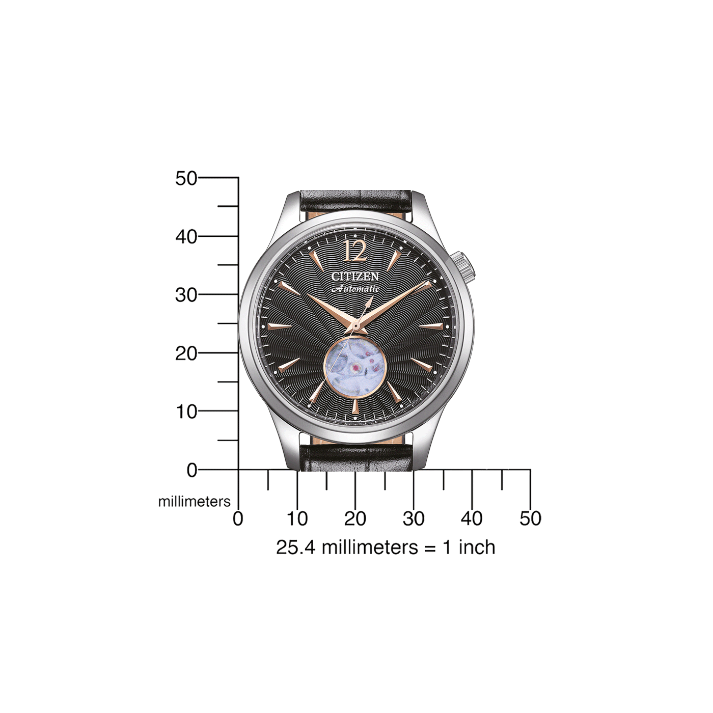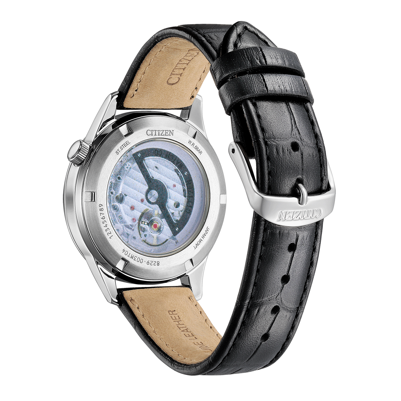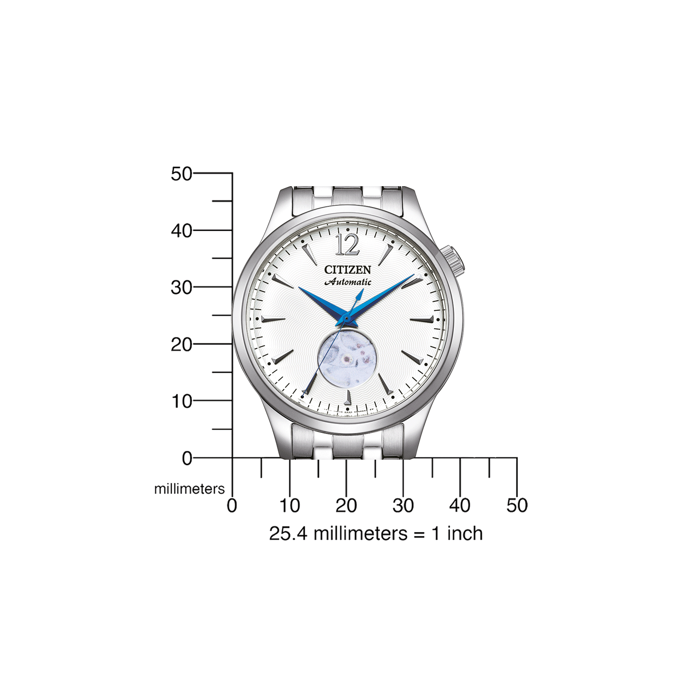 Montre automatique classique à cœur ouvert. Boîtier et bracelet en acier inoxydable, verre en cristal et cadran bleu foncé avec une structure fine, des aiguilles et des index finement pliés. Équipée du calibre mécanique 8229 avec 40 heures de réserve de marche, une précision de +/-20 secondes/jour et une étanchéité à 5 bars. Diamètre du boîtier : 40 mm.