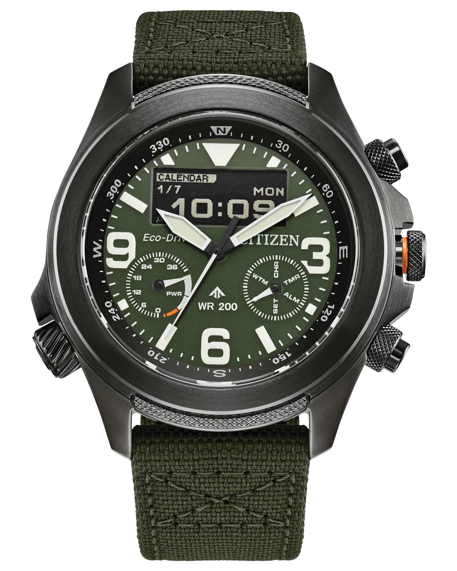 La Citizen Promaster Land U822 est une montre technique pensée pour l’exploration et l’aventure. Elle combine affichage analogique et digital (ana-digi) grâce au calibre U822 Eco-Drive, alimenté par la lumière, éliminant ainsi le besoin de changer la pile. Avec son écran MIP haute visibilité, ses multiples fonctions et son boîtier robuste de 43,9 mm étanche à 200 m, elle s’impose comme un instrument complet et fiable, prêt à relever tous les défis.