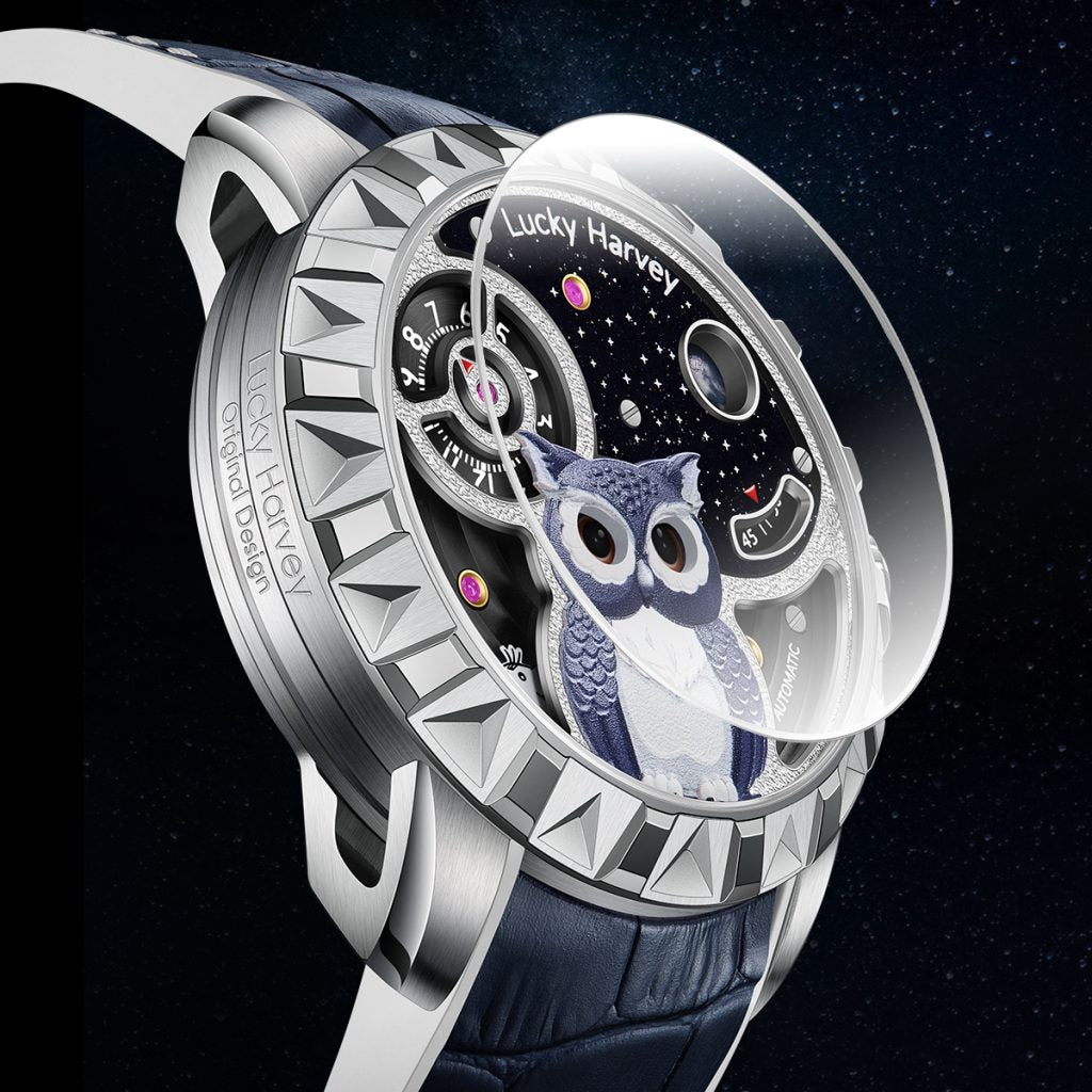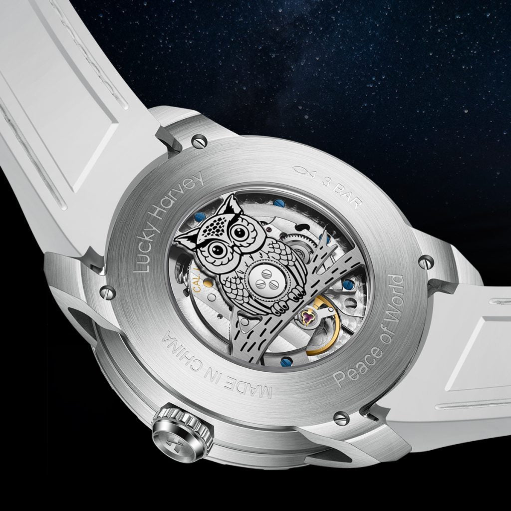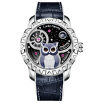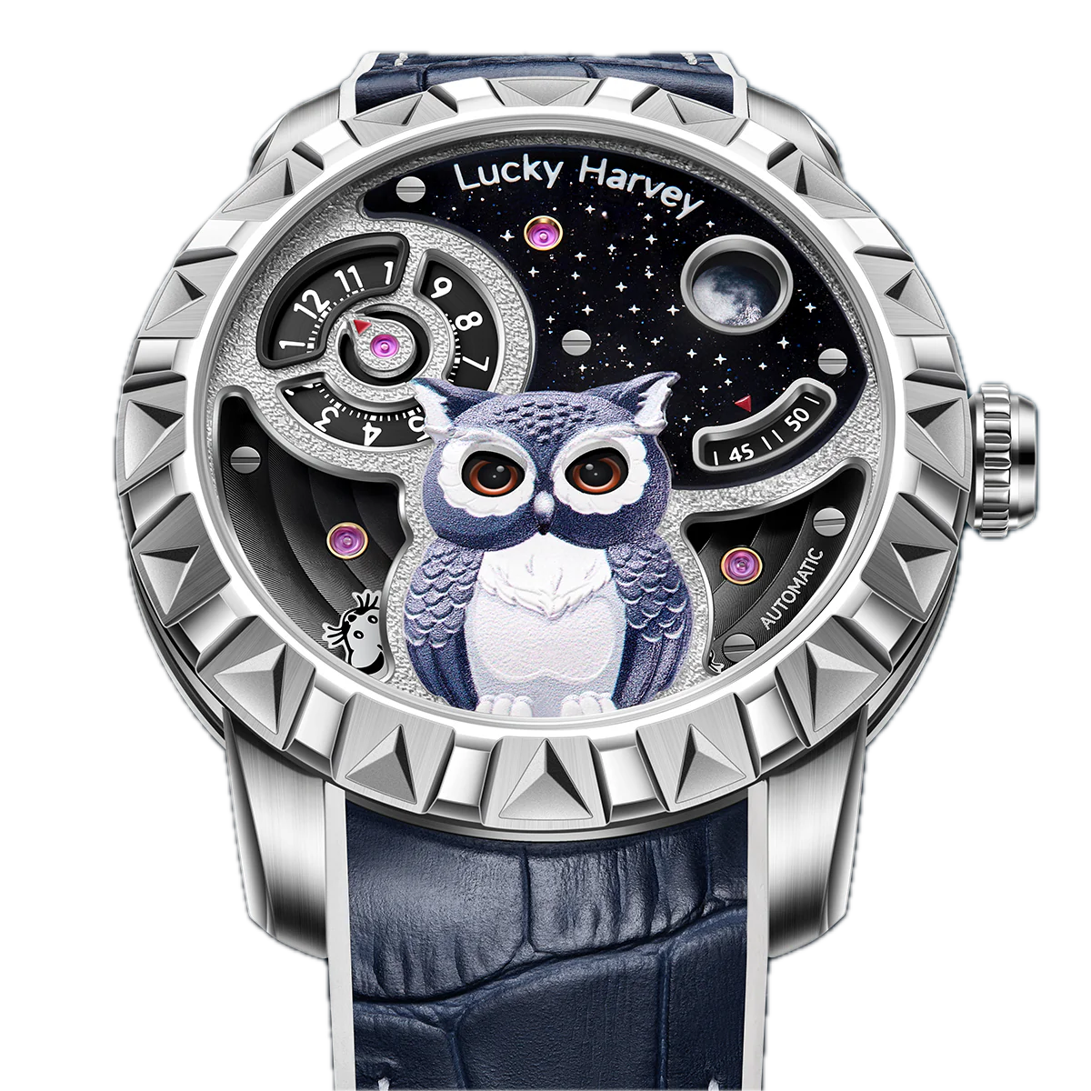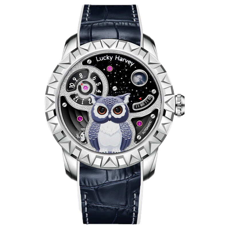 La montre OWL Silver incarne élégance et mystère avec son design inspiré de la silhouette de la chouette, symbole de sagesse et de clairvoyance. Son cadran lumineux offre une lisibilité parfaite, même dans l’obscurité, tandis que le boîtier en acier inoxydable argenté allie robustesse et sophistication. Dotée d’un mouvement automatique de haute précision, cette montre assure une performance fiable et durable. Idéale pour ceux qui apprécient les designs atypiques et les symboles significatifs, l’OWL Silver est un véritable hommage à l’horlogerie contemporaine avec son automate qui au fur et à mesure qu'une heure s'écoule les yeux de la chouette s'ouvrent et se ferment, la lune fait une lunaison complète et les deux souris en bas du cadran sortent et rentrent dans leur cachette.