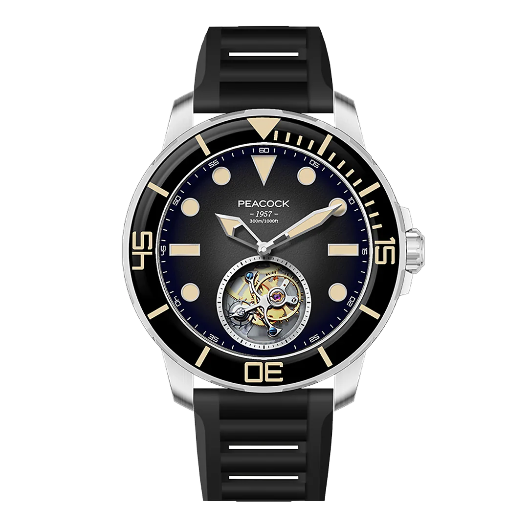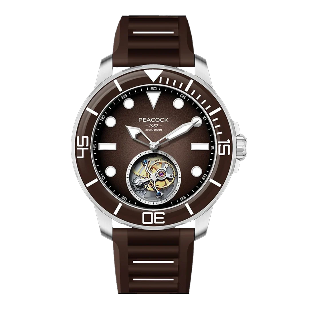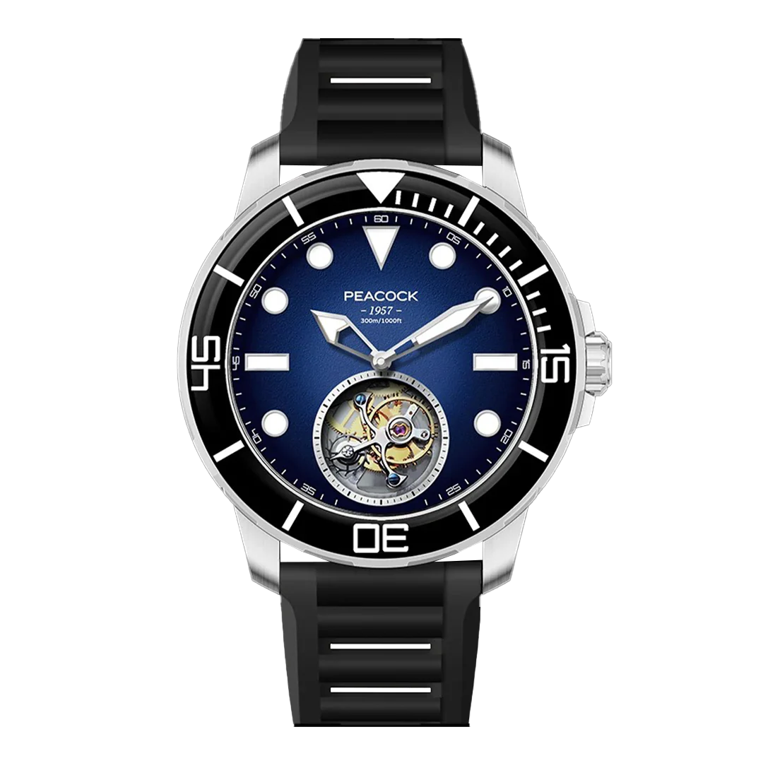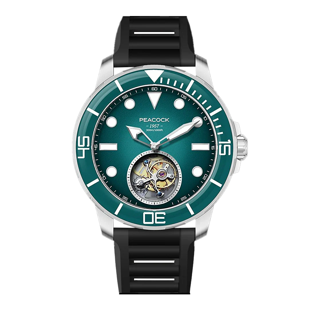 Une montre Peacock de luxe qui allie performance extrême et raffinement horloger, idéale pour les passionnés de plongée et les collectionneurs de tourbillons.