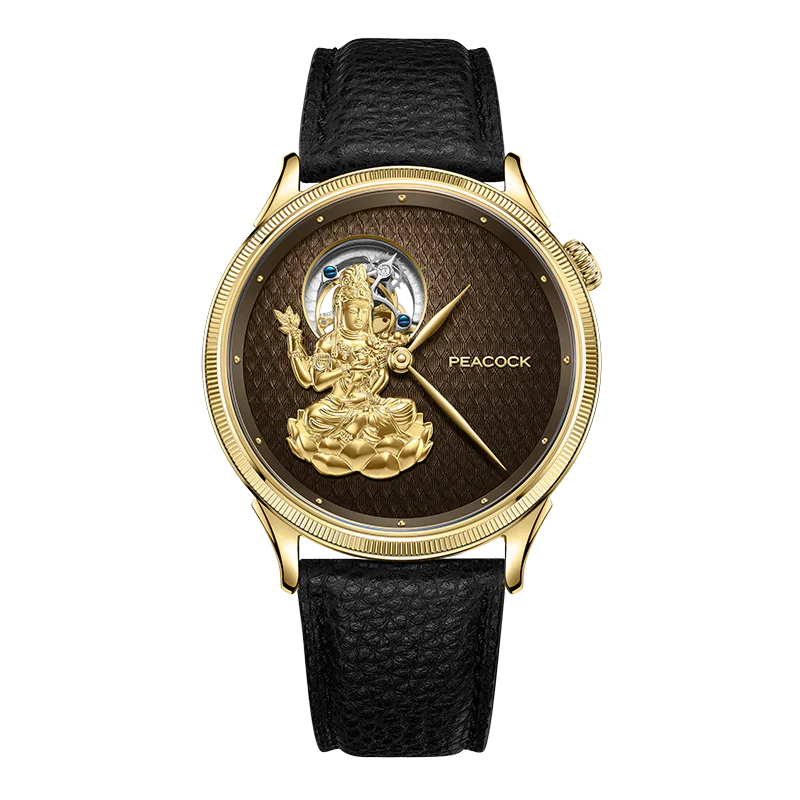 La Peacock Peak Maja-chenmo Tourbillon 18K Gold est une pièce d’exception qui illustre l’expertise horlogère de Peacock, l’une des plus anciennes manufactures chinoises, fondée en 1957.