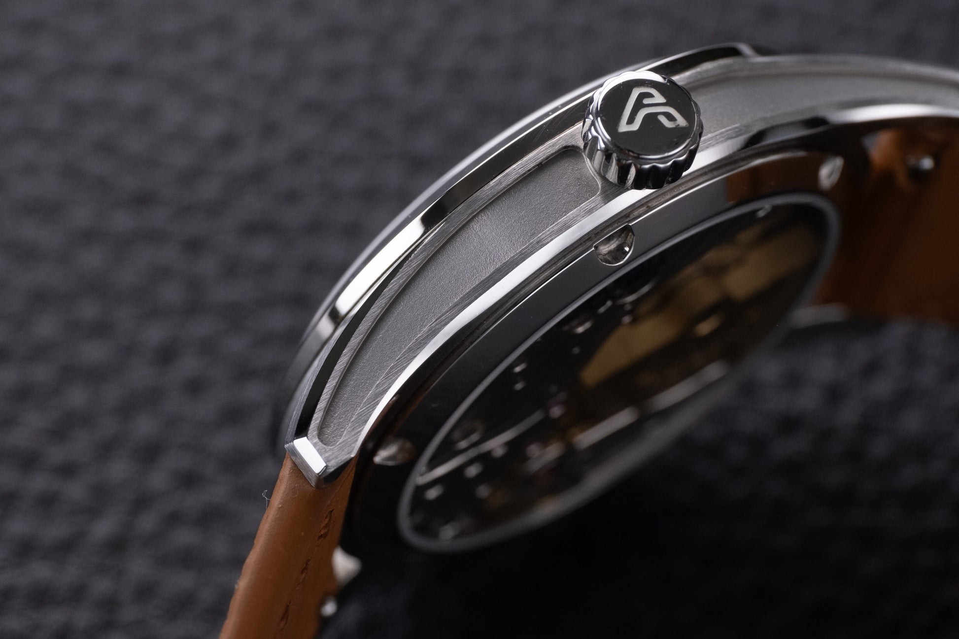Le boîtier en acier inoxydable de 36 mm est doté d'une lunette hautement polie, d' une finition brossée verticalement sur les cornes et d' une finition sablée sur la partie centrale encastrée usinée CNC.