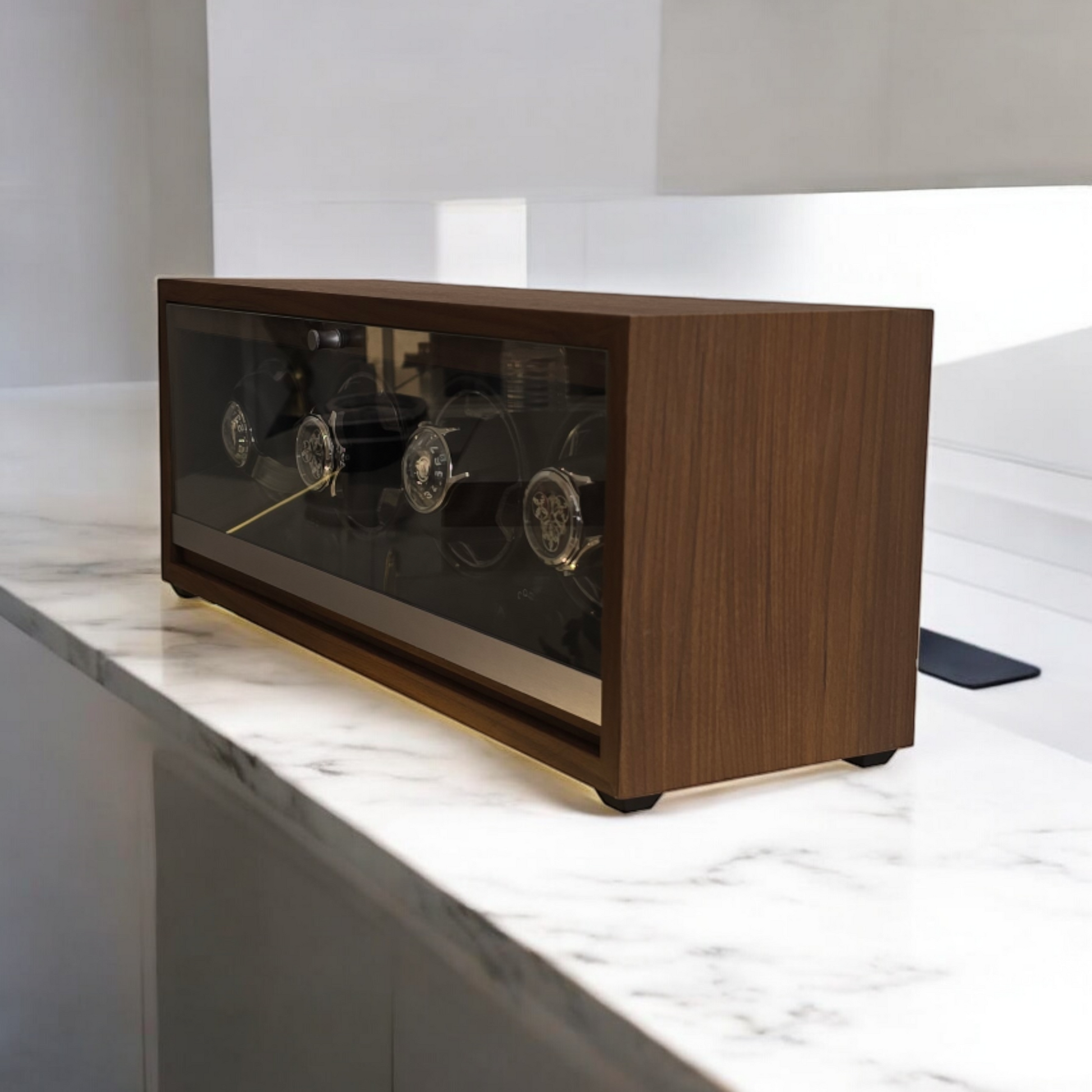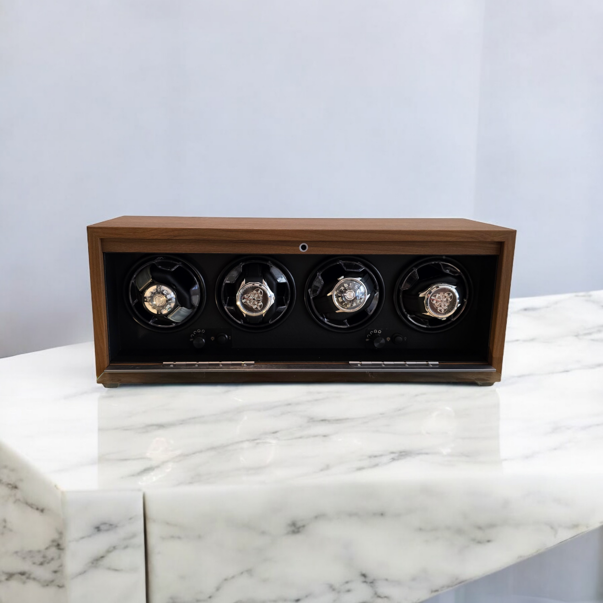 Un remontoir à montres, ou winder, est un dispositif conçu pour maintenir les montres automatiques en état de marche lorsqu'elles ne sont pas portées, simulant les mouvements du poignet pour que la montre conserve l'heure exacte. Ce modèle présente un design élégant avec une finition en bois naturel et un intérieur noir contrastant, mettant en valeur chaque montre. Les quatre compartiments sont équipés de mécanismes de rotation discrets et silencieux, combinant fonctionnalité et esthétique raffinée, parfait pour les collectionneurs et les amateurs de montres.
