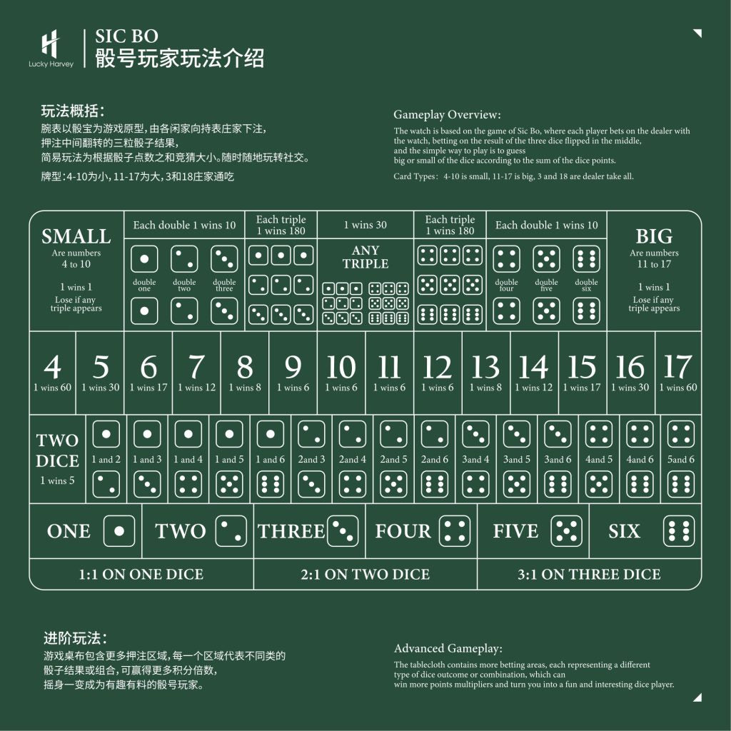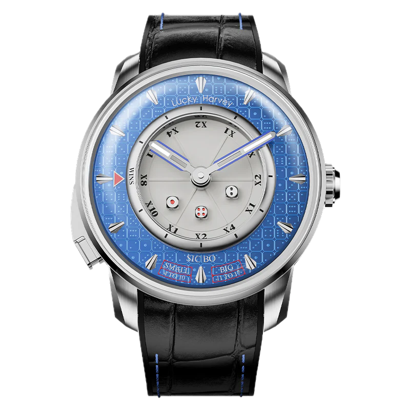 La montre Sic Bo Blue de Lucky Harvey marie l’élégance horlogère à l’univers du jeu. Inspirée du célèbre jeu de dés asiatique Sic Bo, elle se distingue par un cadran aux détails uniques et un bleu profond captivant. Le design innovant du cadran intègre des motifs de dés et de jeu, offrant une touche distinctive pour les amateurs d’originalité. Animée par un mouvement automatique précis et protégée par un boîtier en acier inoxydable robuste, cette montre garantit durabilité et style. Avec son verre saphir résistant aux rayures et sa couleur vive, la Sic Bo Blue est parfaite pour ceux qui recherchent une montre audacieuse et élégante. Il suffit de presser le bouton à 8 heures et le disque central se met à tourner pour lancer les 3 dés.