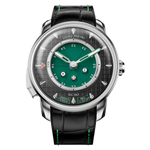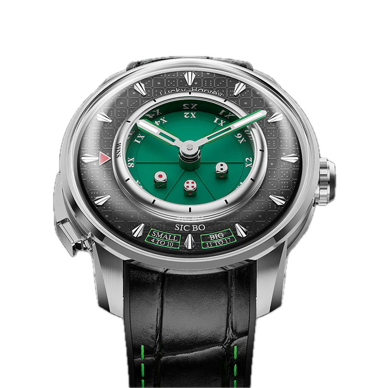 La montre Sic Bo Verte de Lucky Harvey marie l’élégance horlogère à l’univers du jeu. Inspirée du célèbre jeu de dés asiatique Sic Bo, elle se distingue par un cadran aux détails uniques et un bleu profond captivant. Le design innovant du cadran intègre des motifs de dés et de jeu, offrant une touche distinctive pour les amateurs d’originalité. Animée par un mouvement automatique précis et protégée par un boîtier en acier inoxydable robuste, cette montre garantit durabilité et style. Avec son verre saphir résistant aux rayures et sa couleur vive, la Sic Bo Blue est parfaite pour ceux qui recherchent une montre audacieuse et élégante. Il suffit de presser le bouton à 8 heures et le disque central se met à tourner pour lancer les 3 dés.