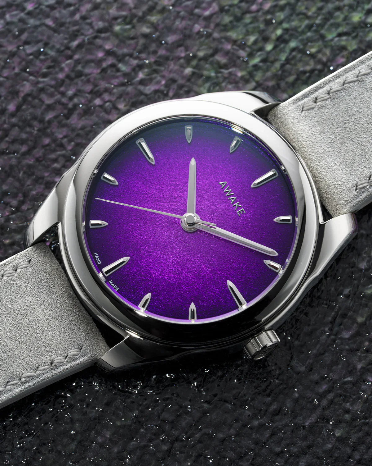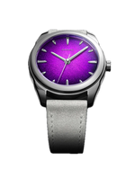 Provocateur et envoûtant, ce violet complexe joue avec la lumière pour accentuer son mystère. Son dégradé vignette assombrit les contours, renforçant son intensité et son aura spirituelle. Moderne et affirmée de jour, la montre devient intrigante et presque mystique dans l’obscurité. Une pièce audacieuse, pensée comme une véritable déclaration de style.
