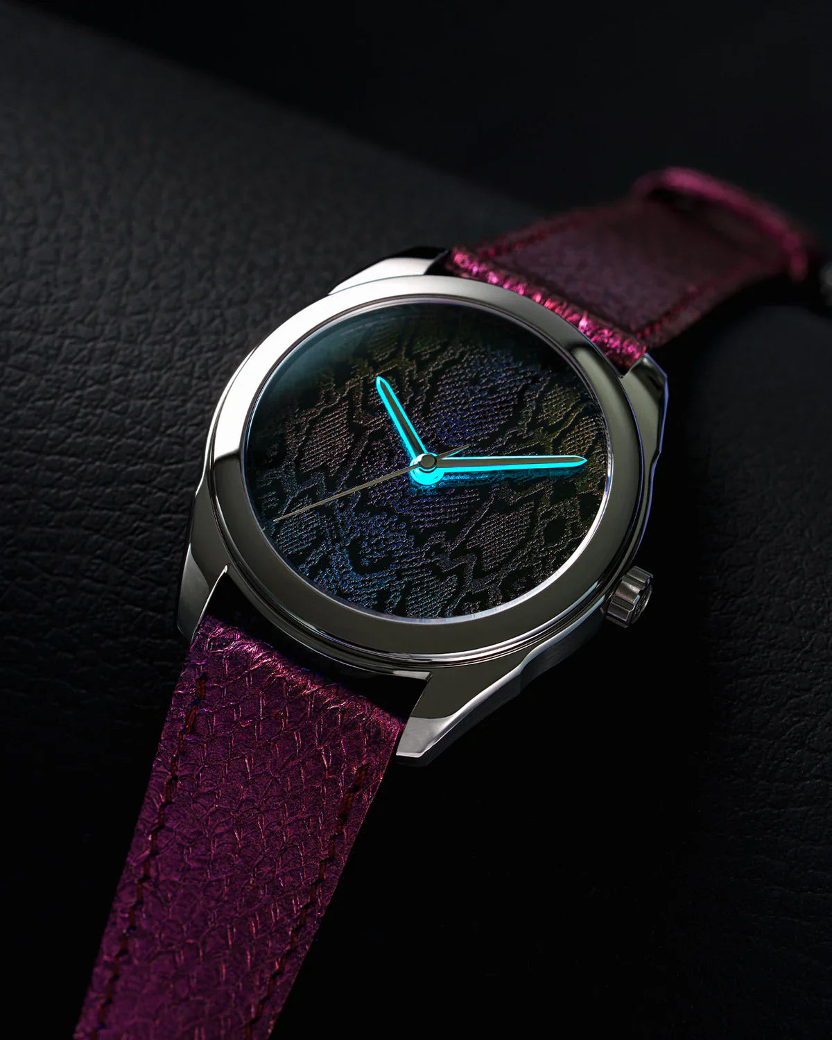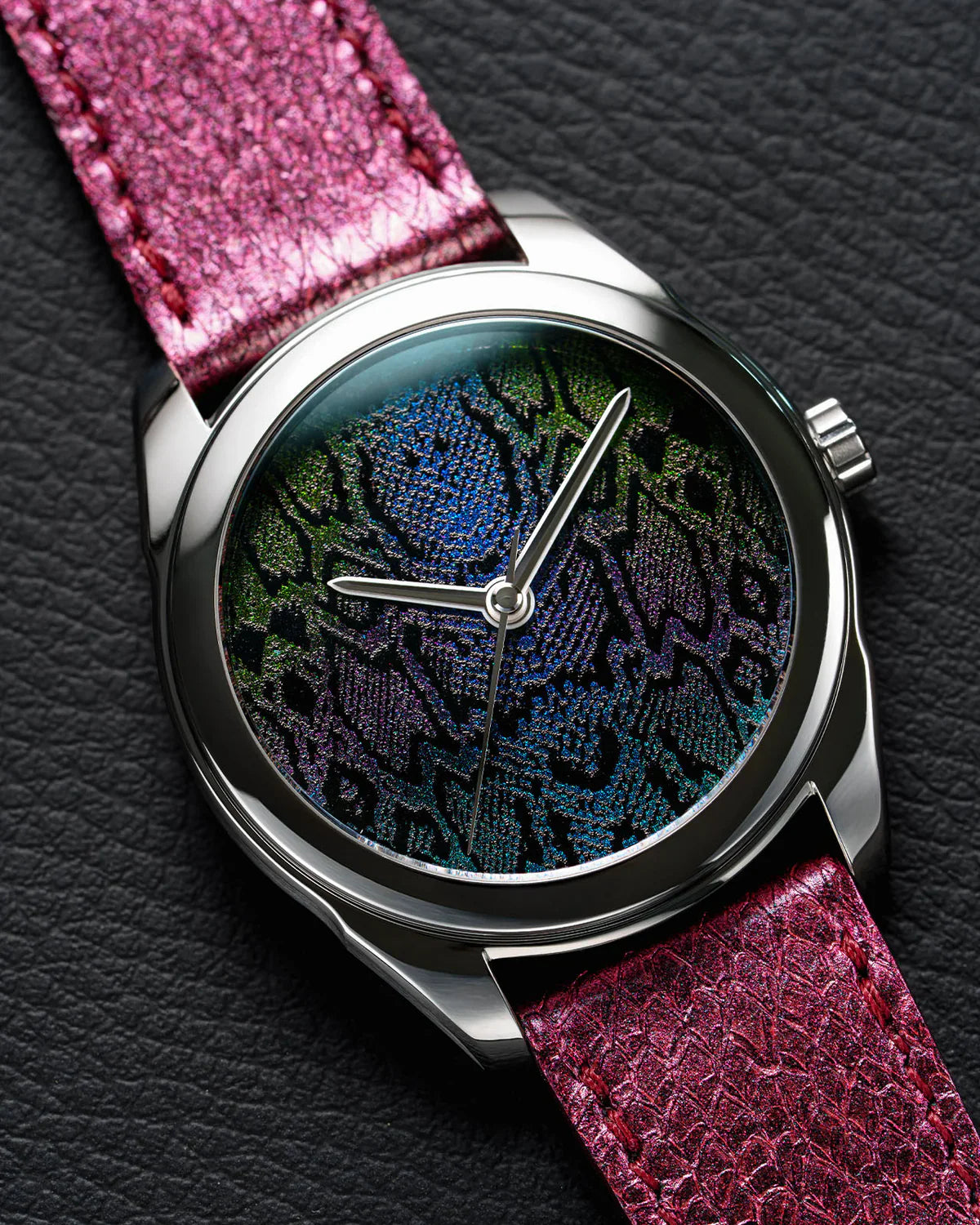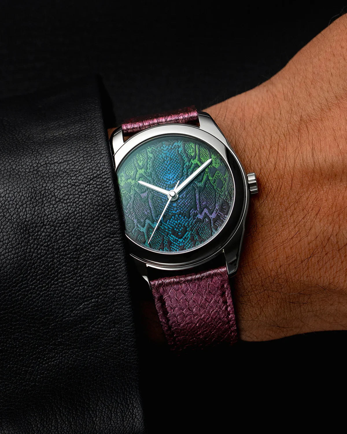 • Cadran en laque traditionnelle vietnamienne Sơn Mài, enrichi de pigments noirs naturels, fabriqué à la main au Vietnam par nos maîtres laqueurs, puis personnalisé avec un motif « peau de serpent », également réalisé à la main en Écosse par l’artiste contemporain The Dial Artist