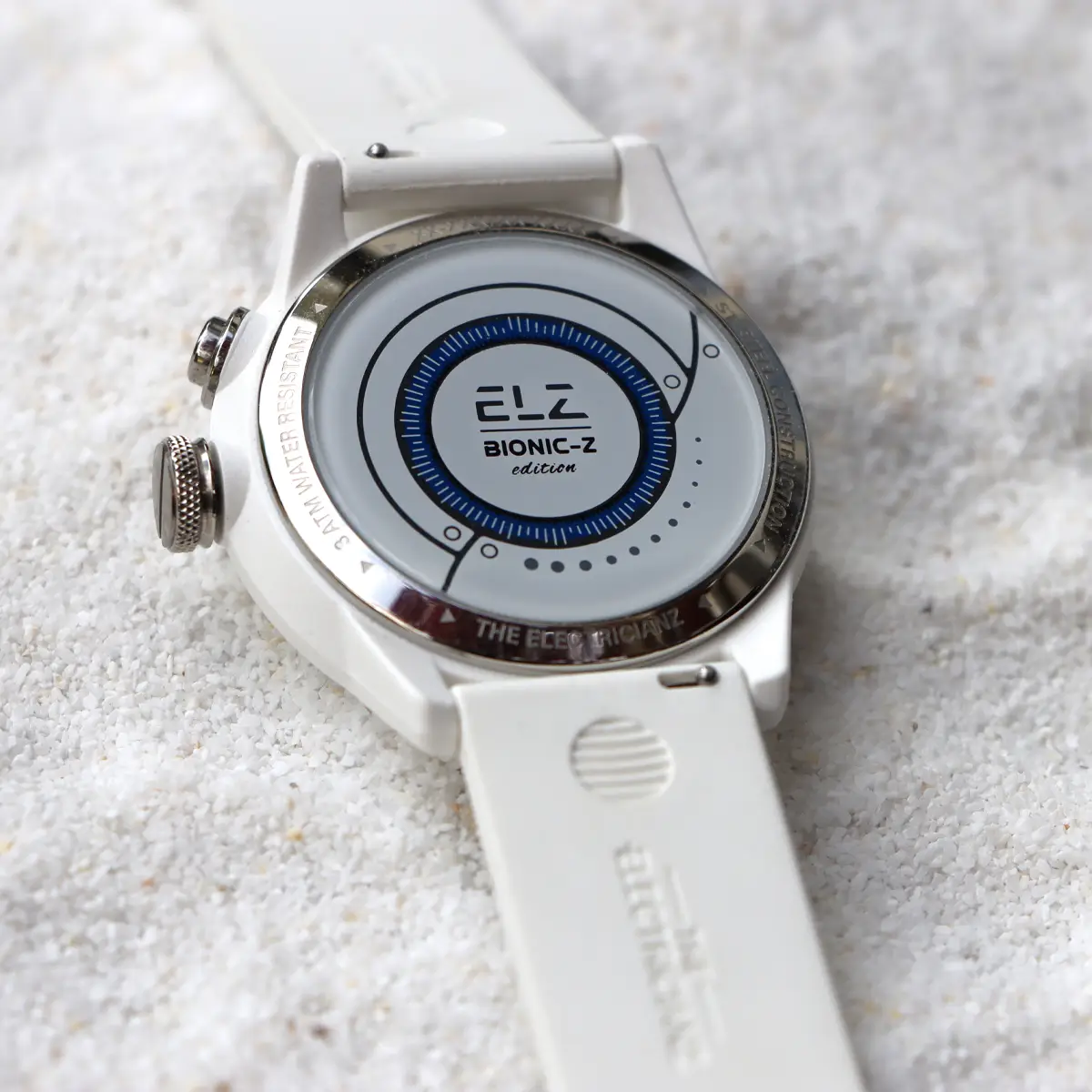 Fabriquée avec précision et élégance, la Bionic Z Edition est logée dans un élégant boîtier en acier inoxydable de 42 mm, rehaussé d'un extérieur en céramique MAT blanche raffinée, injectée dans un robuste étui en nylon. Grâce à sa construction robuste, cette montre résiste à l'abrasion et aux fissures dues au stress, et sa structure semblable à celle de la paraffine garantit un toucher doux et soyeux.