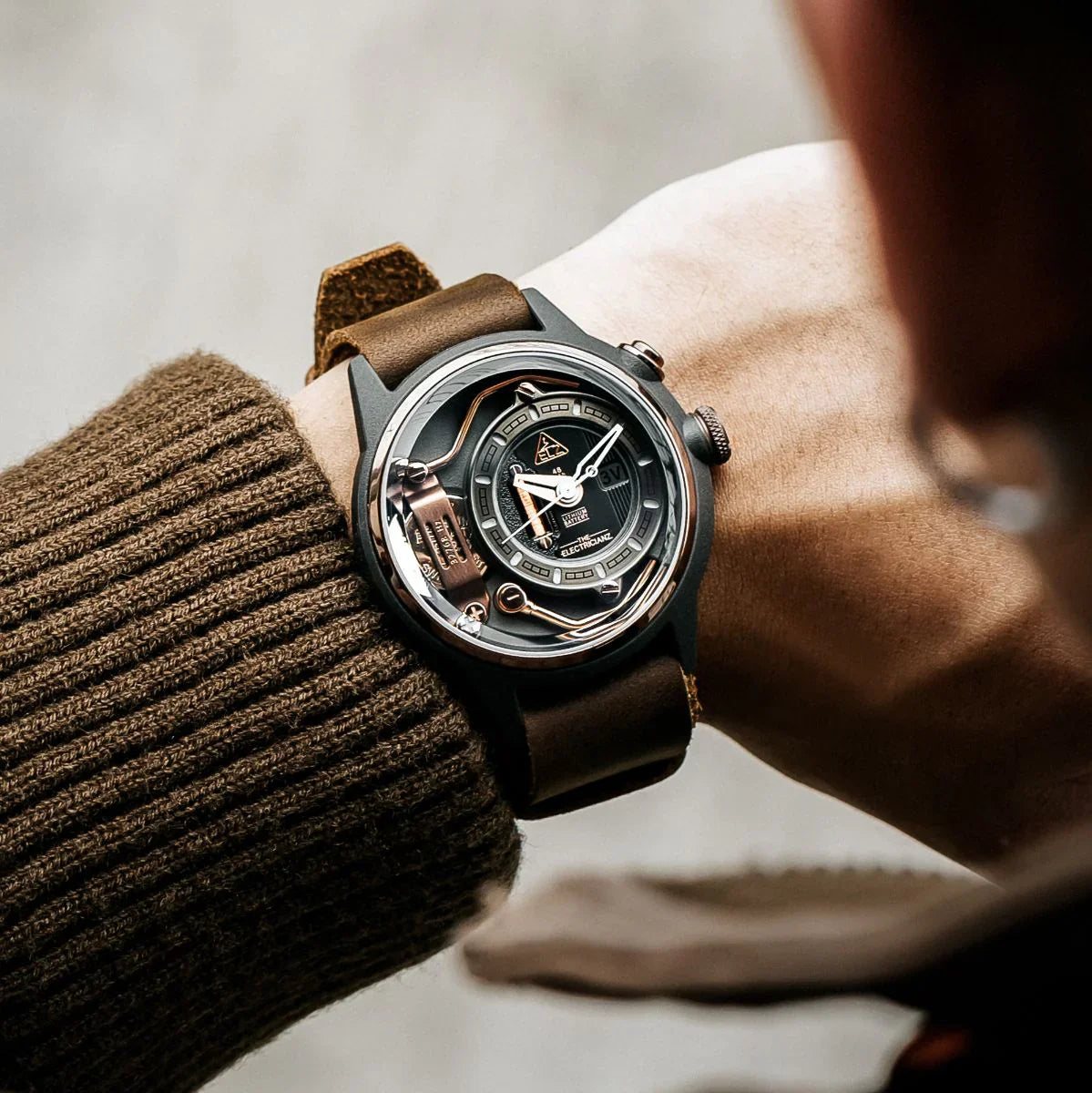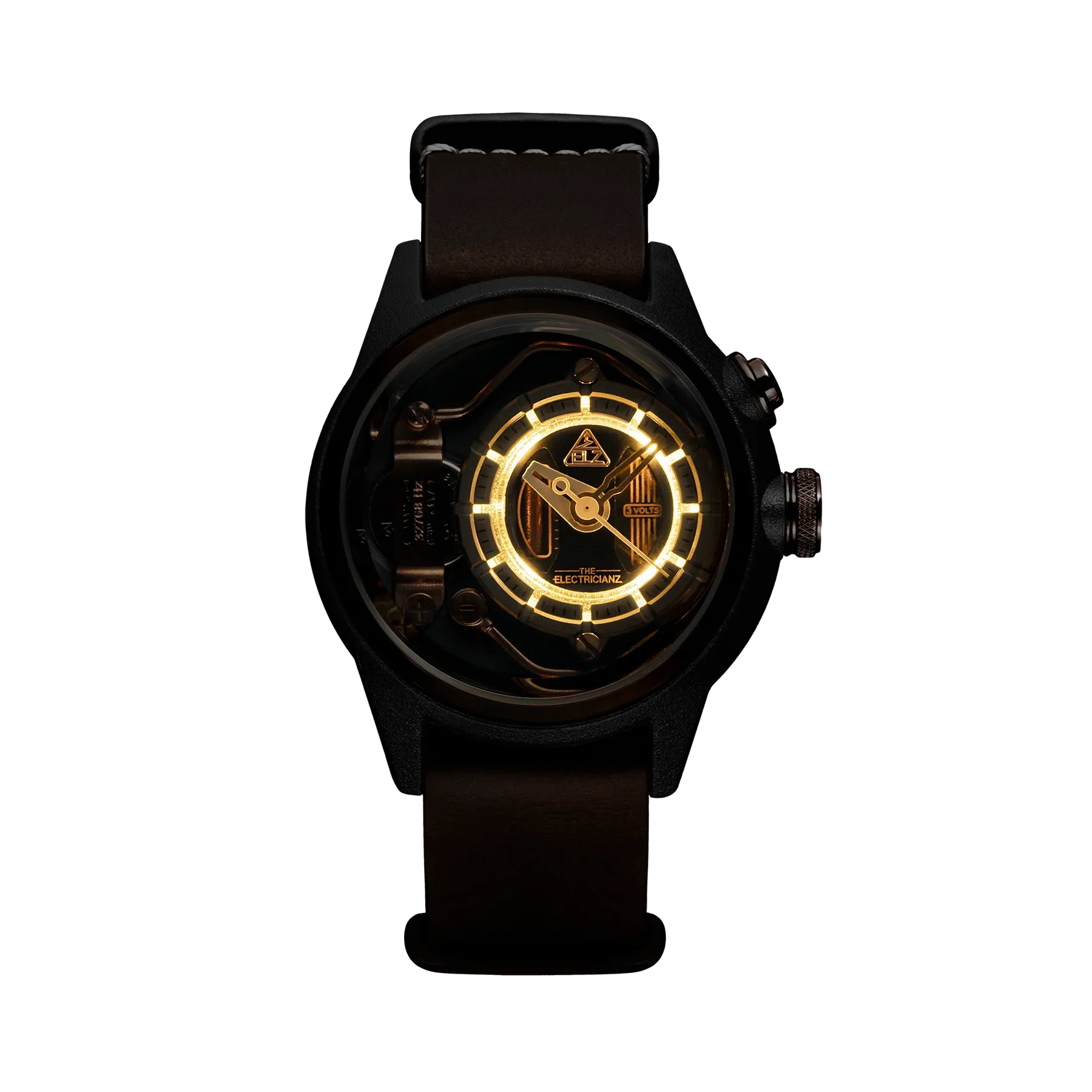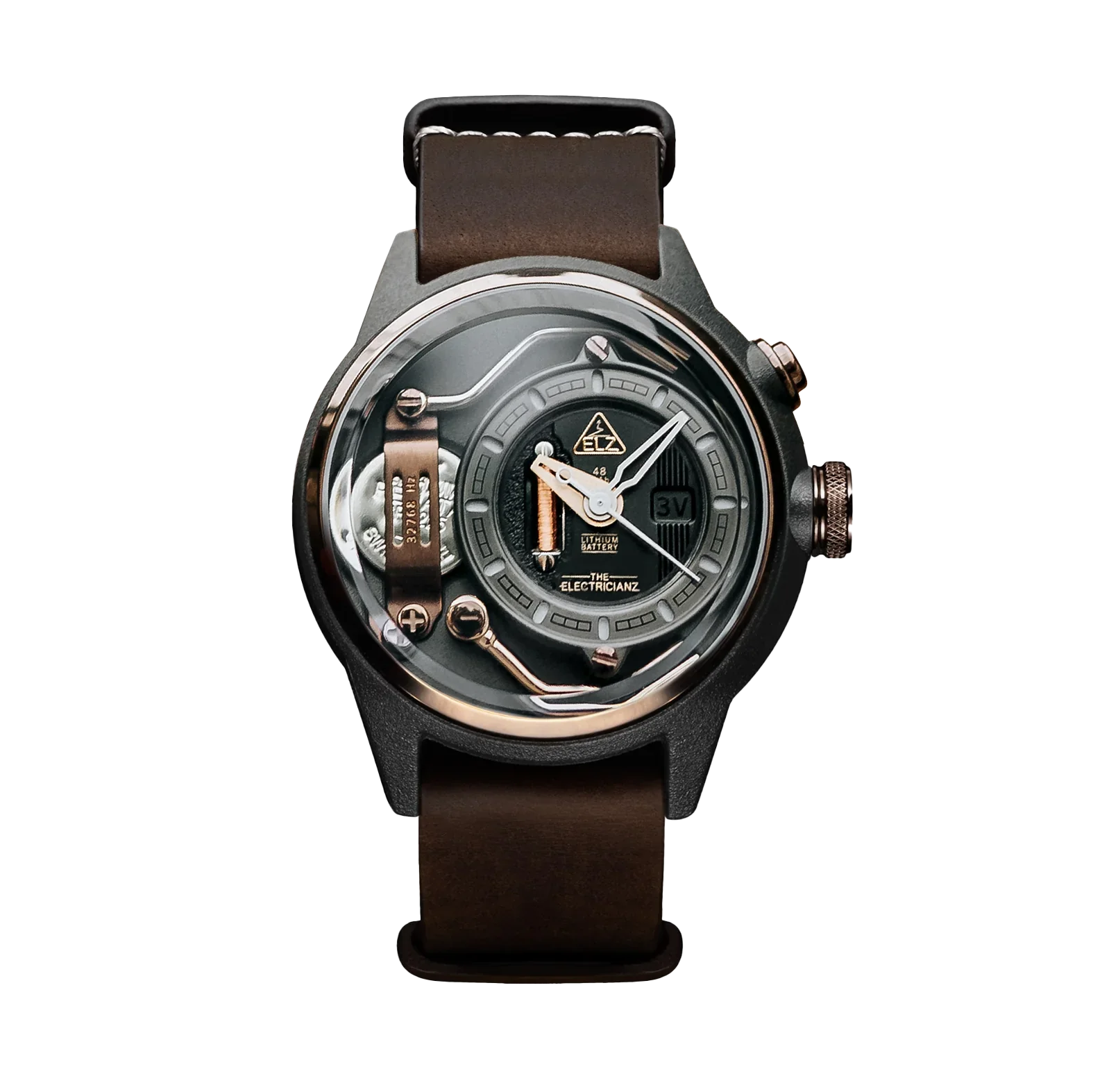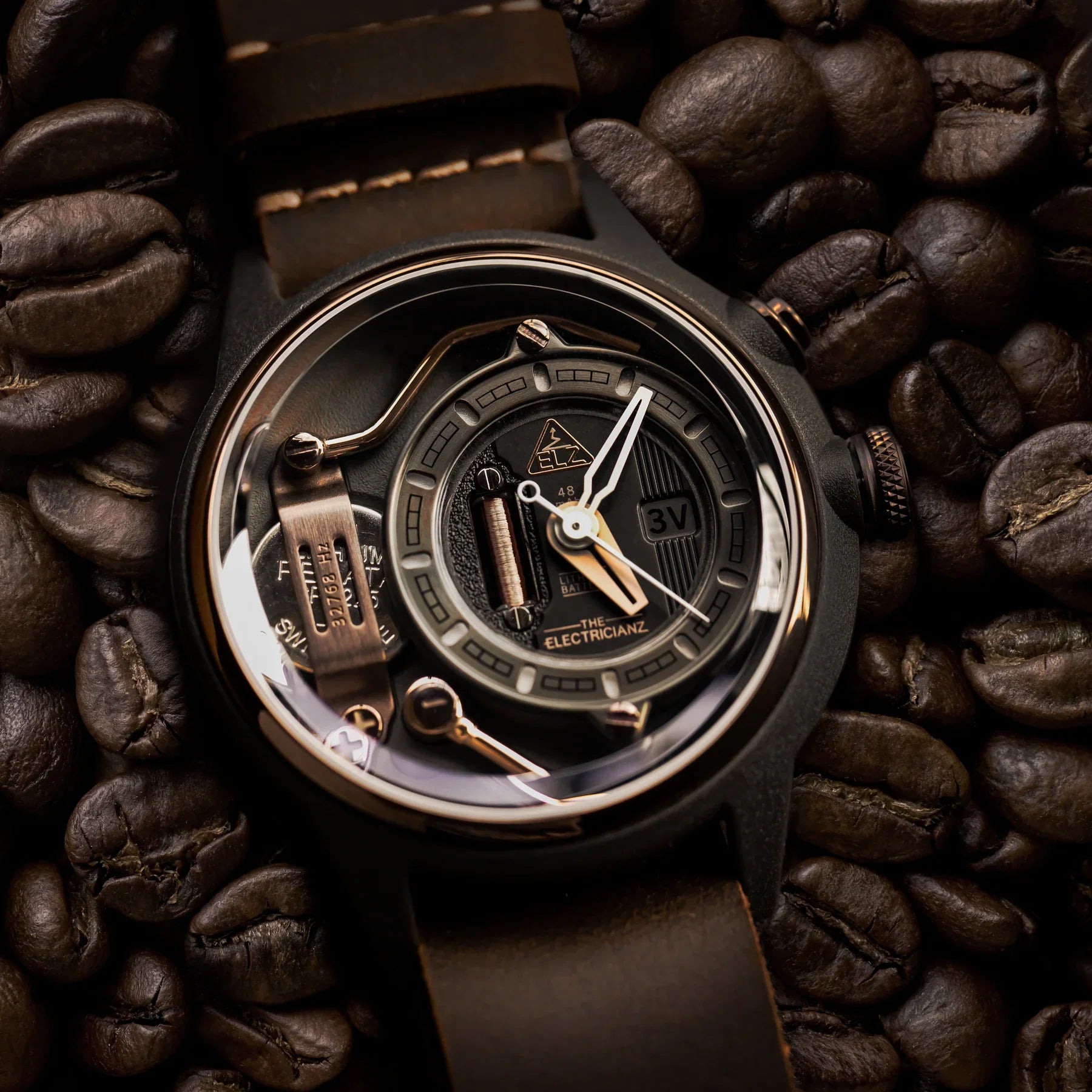 Le Mokaz : Un somptueux cuir velouté enveloppe le délicat boîtier de la Mokaz. Les couleurs automnales rehaussent élégamment le volume de la montre, mettant en valeur sa profondeur et sa rondeur. C'est une véritable Electricianz et c'est la nuit qu'elle révèle toute sa puissance. Vous étiez prévenus !