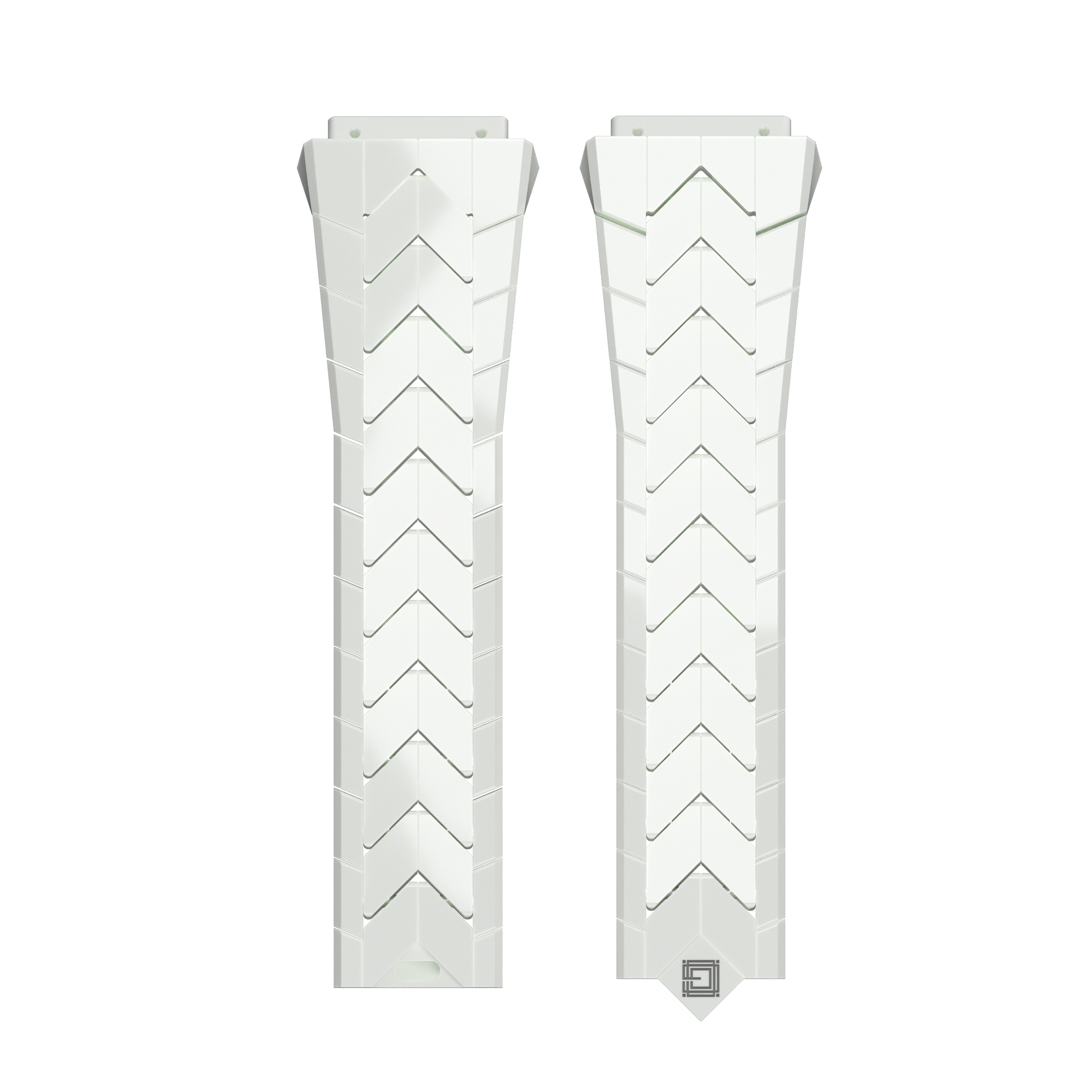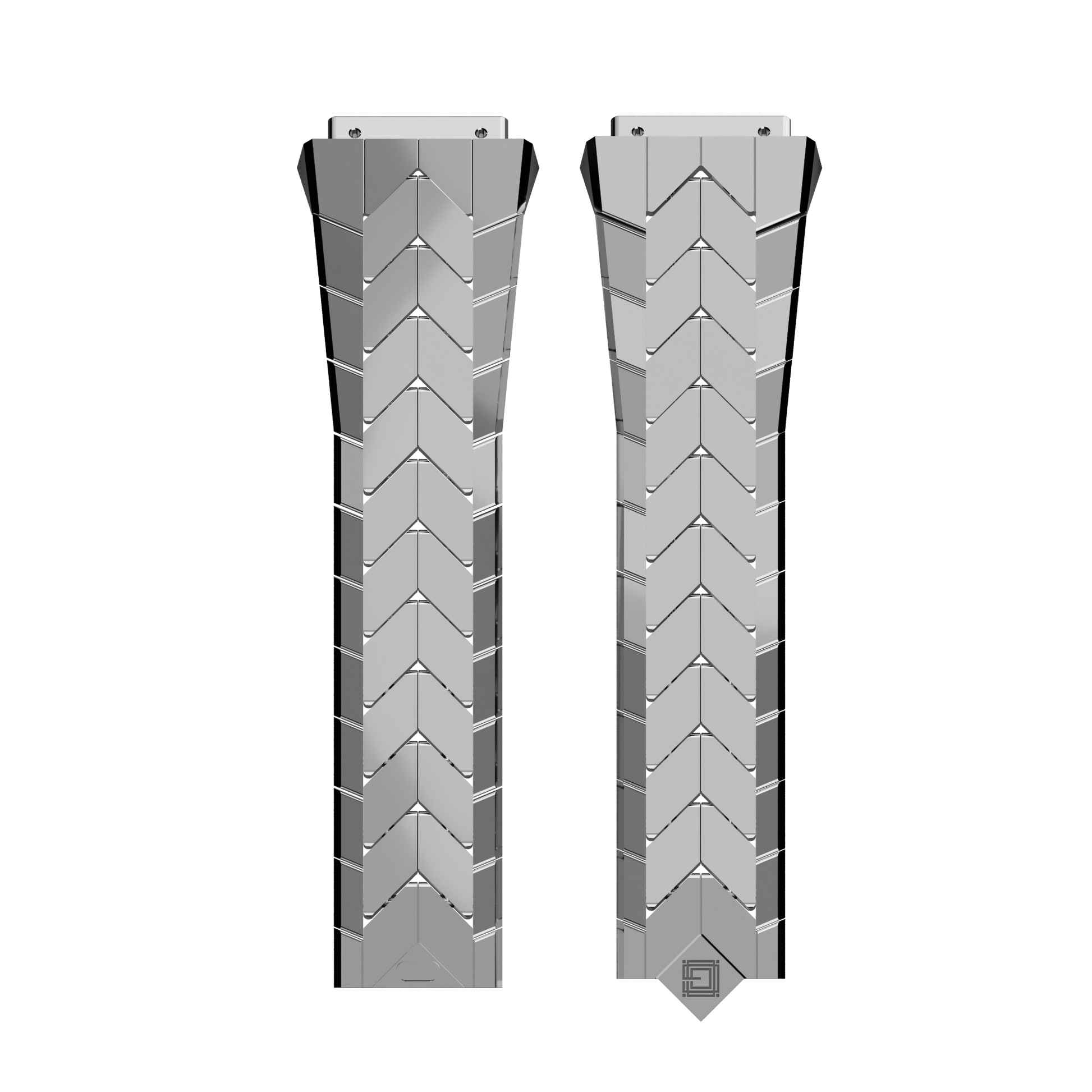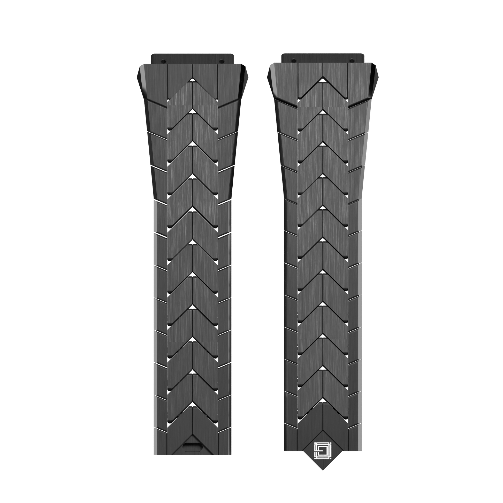 Nos bracelets assortis sont disponibles dans chaque matériau de boîtier, offrant une continuité harmonieuse avec le langage esthétique de la montre. Chaque bracelet arbore une identité esthétique unique, inspirée par la texture audacieuse et robuste des sculptures de pneus — une fusion puissante entre force industrielle et sophistication contemporaine. Le chanfrein poli du boîtier se prolonge avec fluidité le long des maillons, créant une silhouette visuelle cohérente et unifiée.