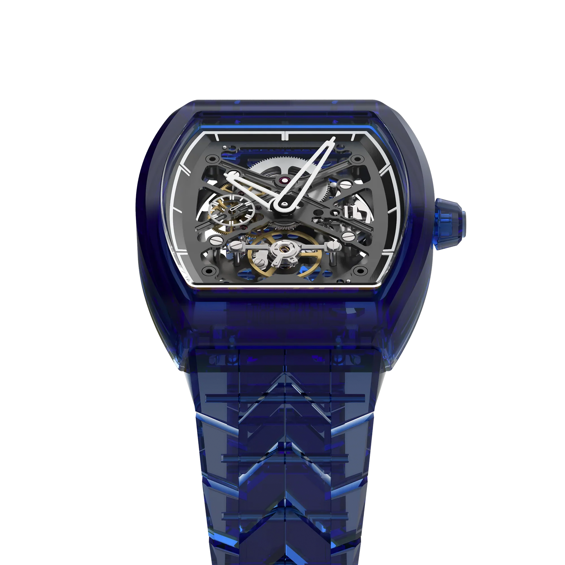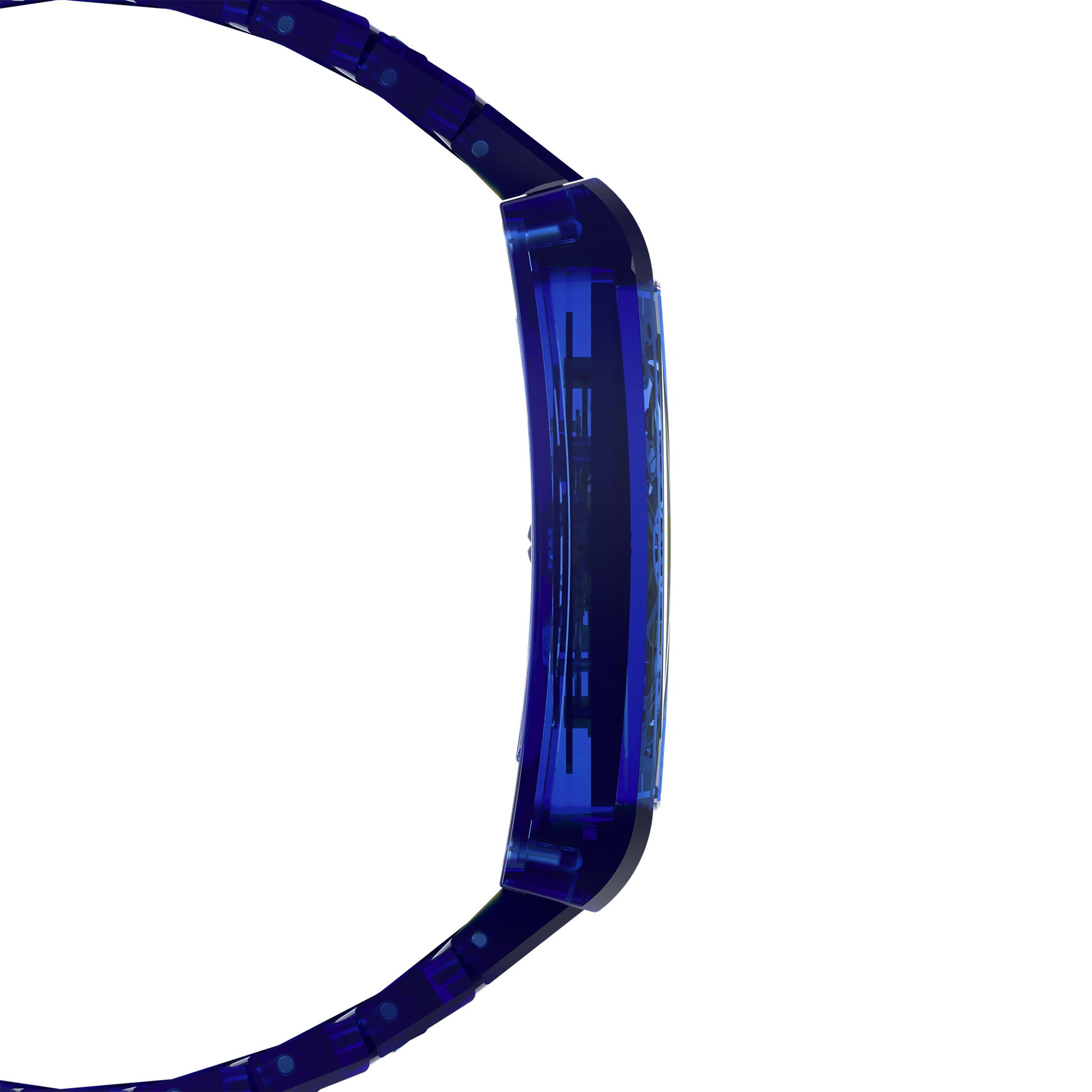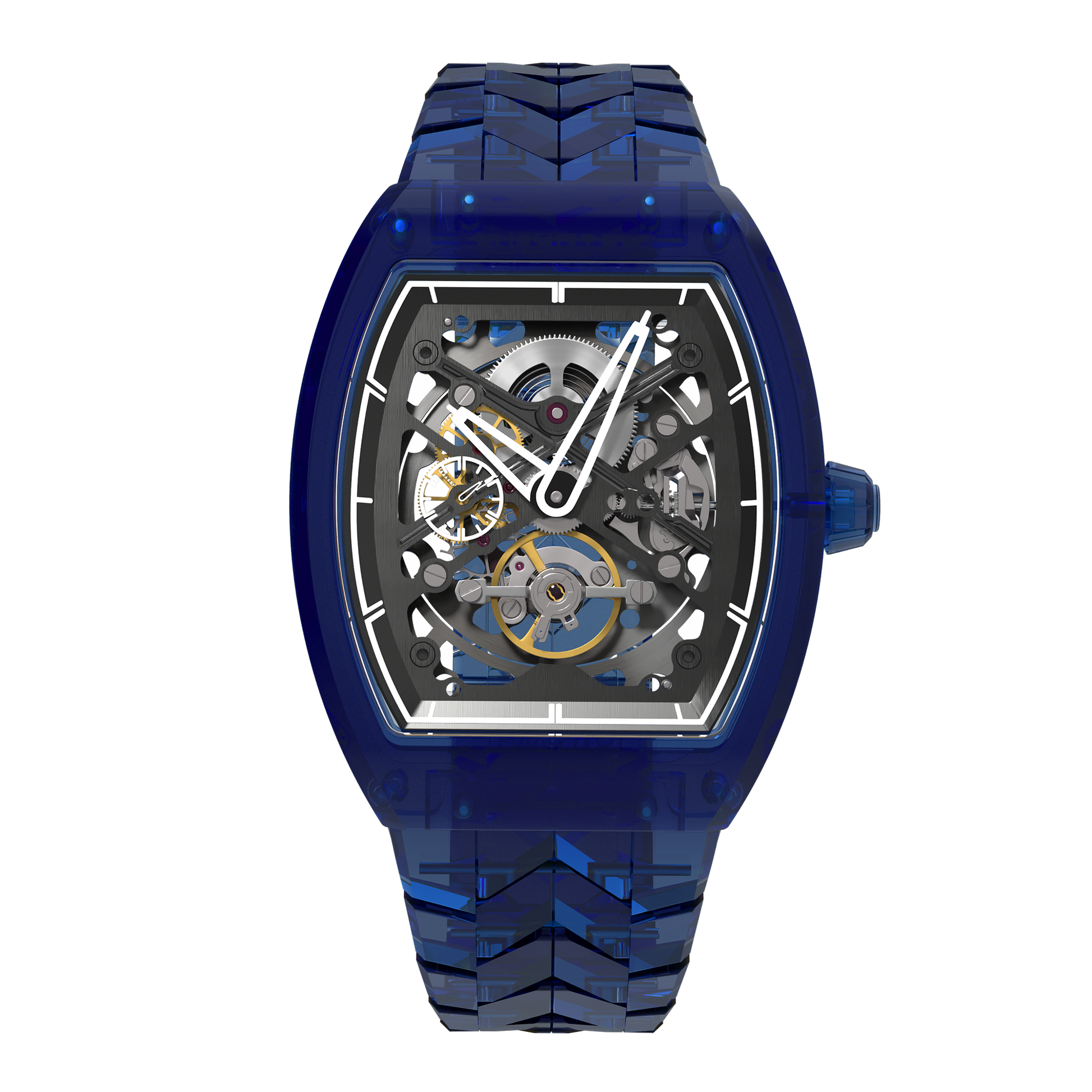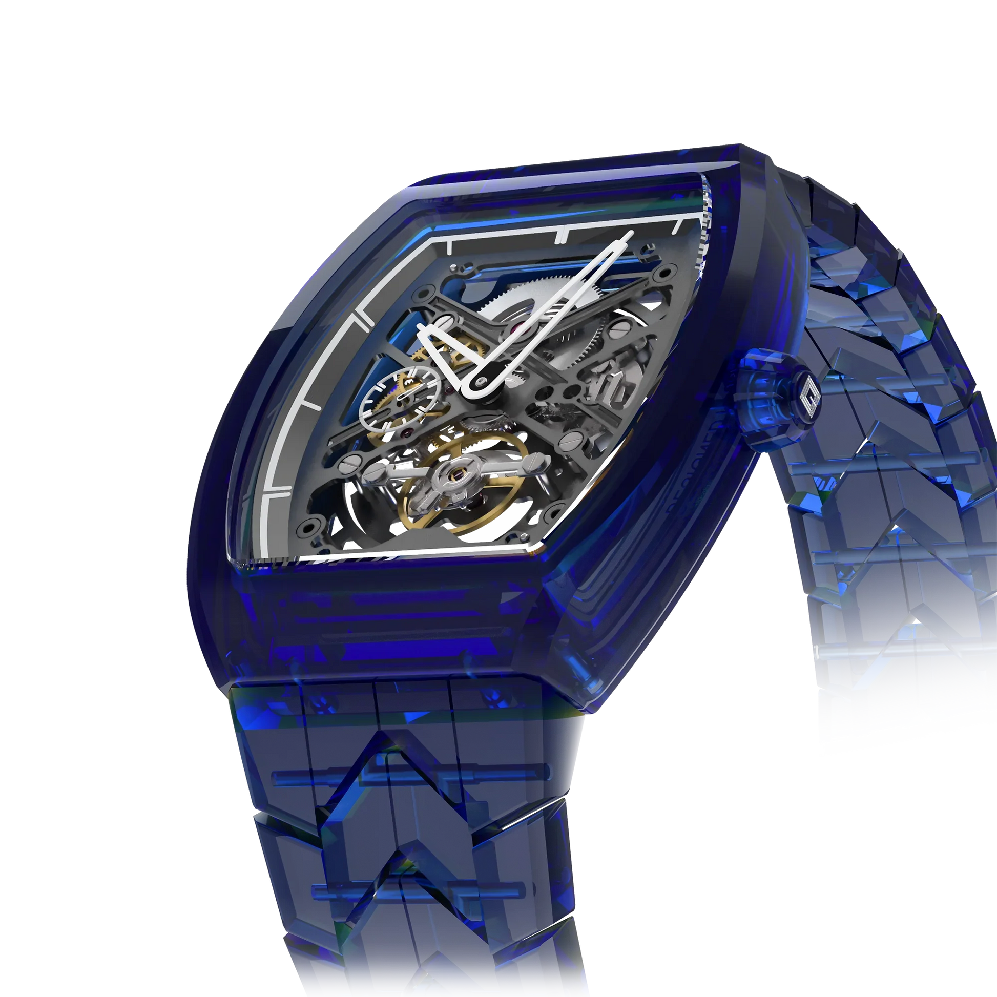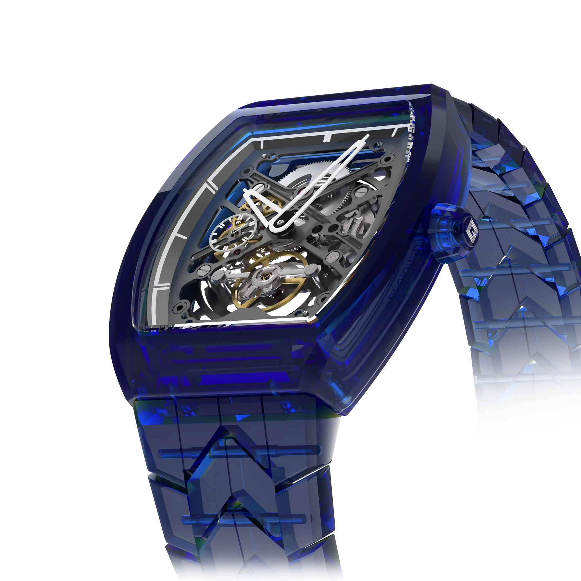 Le saphir est un matériau très prisé — affichant une dureté proche de celle du diamant (9 sur l’échelle de Mohs), une sensation de verre au toucher et une apparence semi-transparente. Nous le proposons en six déclinaisons de couleur, chacune disponible avec bracelet assorti ou sur strap.