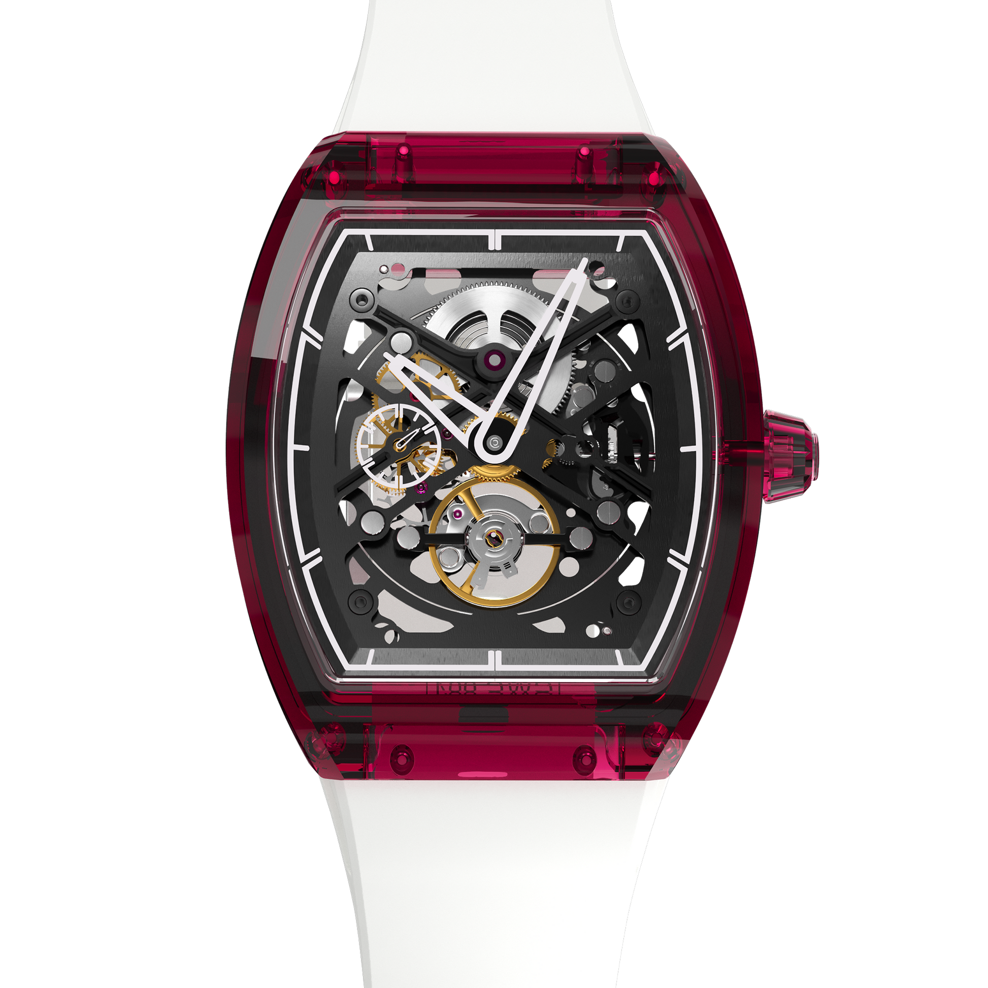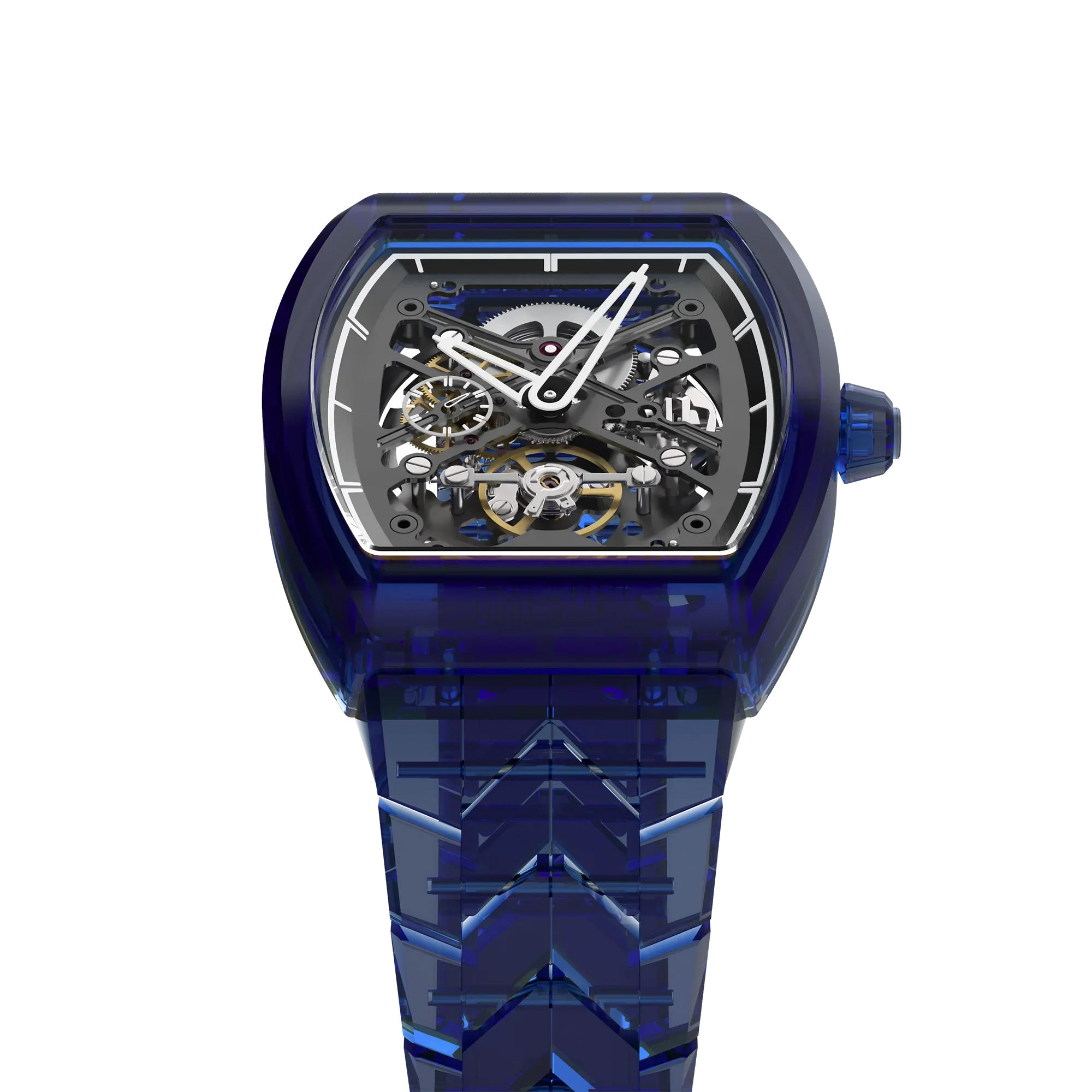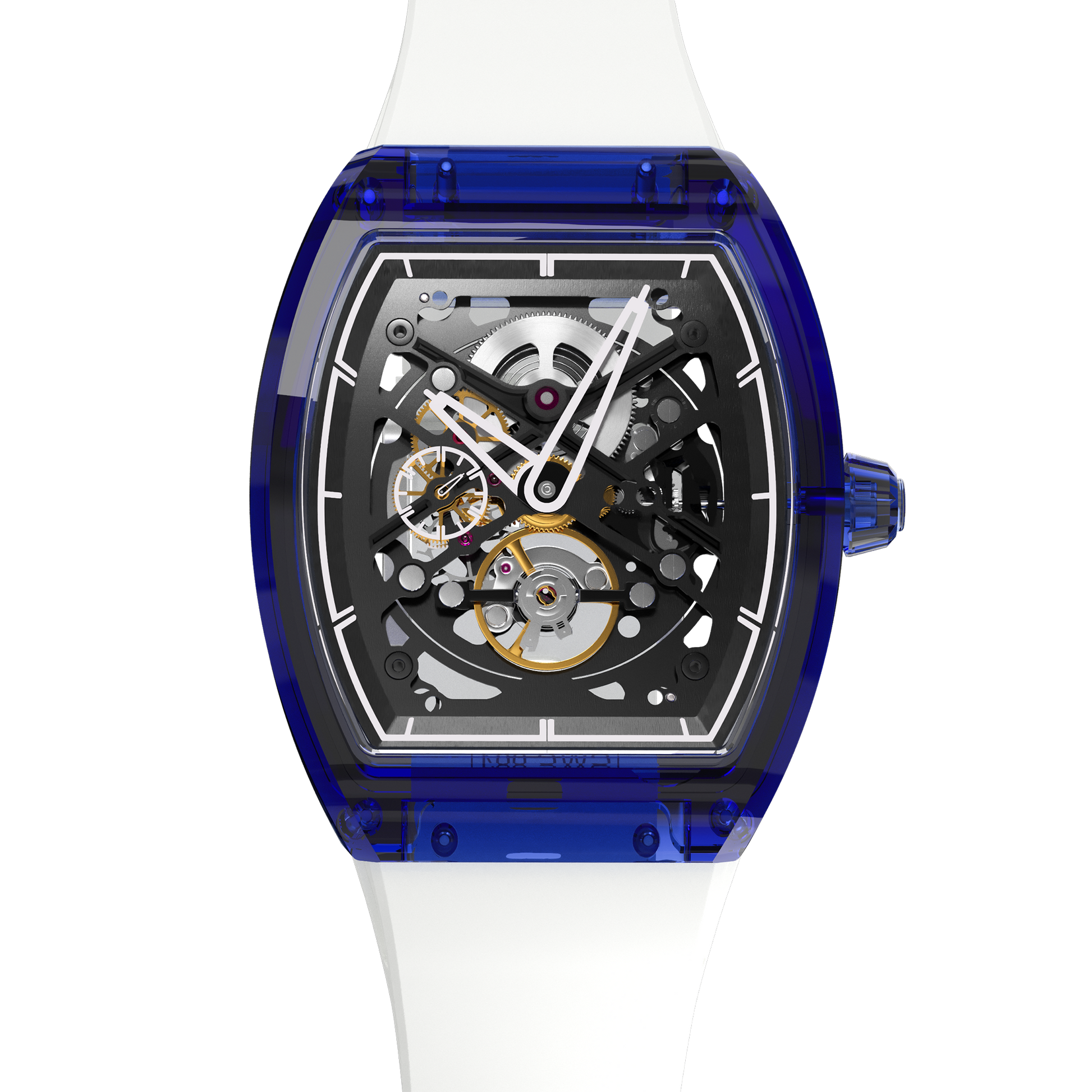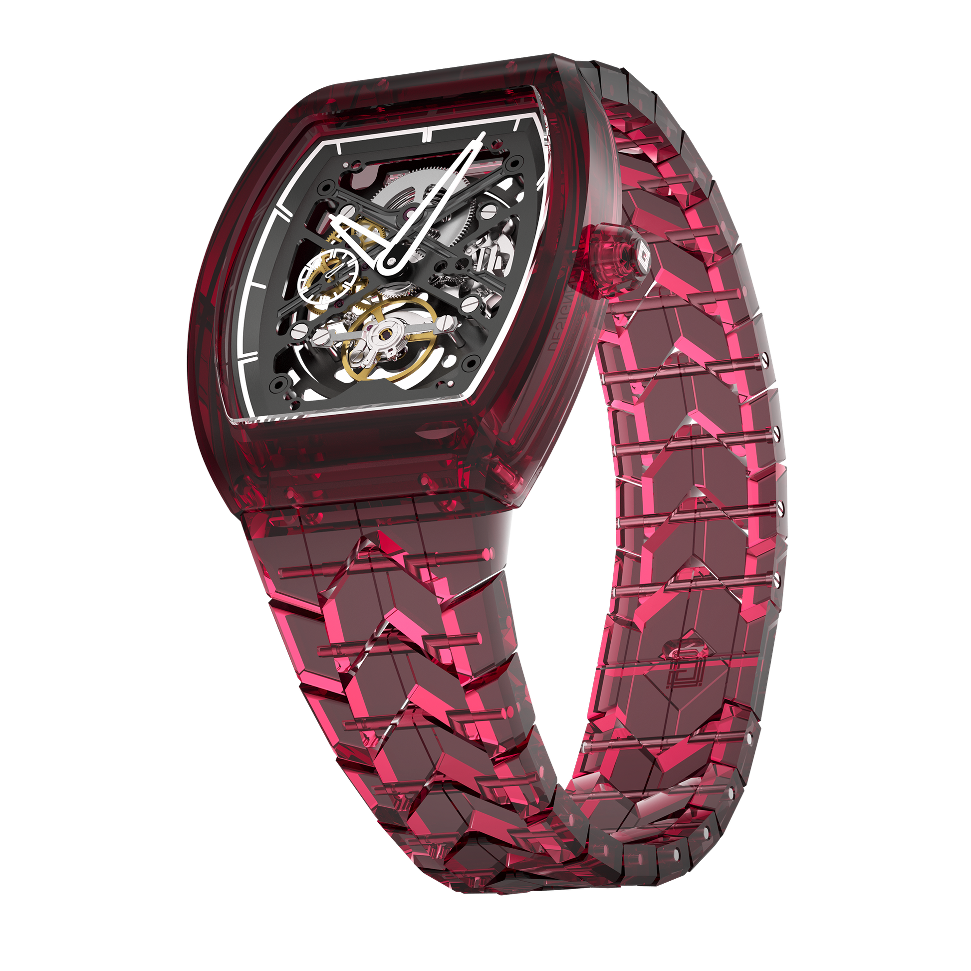 Le saphir est un matériau très prisé — affichant une dureté proche de celle du diamant (9 sur l’échelle de Mohs), une sensation de verre au toucher et une apparence semi-transparente. Nous le proposons en six déclinaisons de couleur, chacune disponible avec bracelet assorti ou sur strap.
