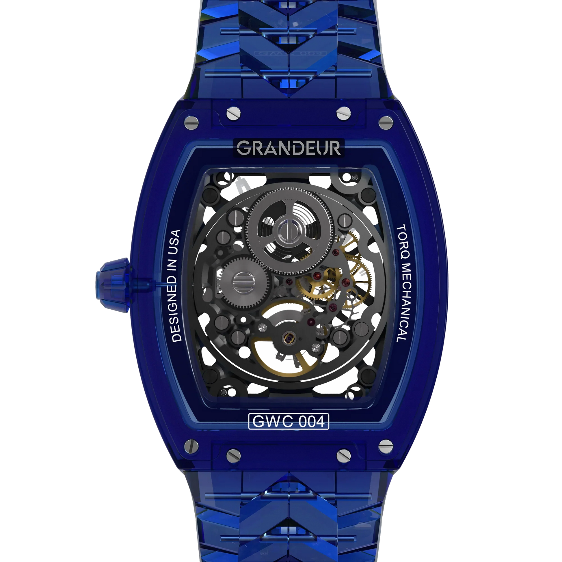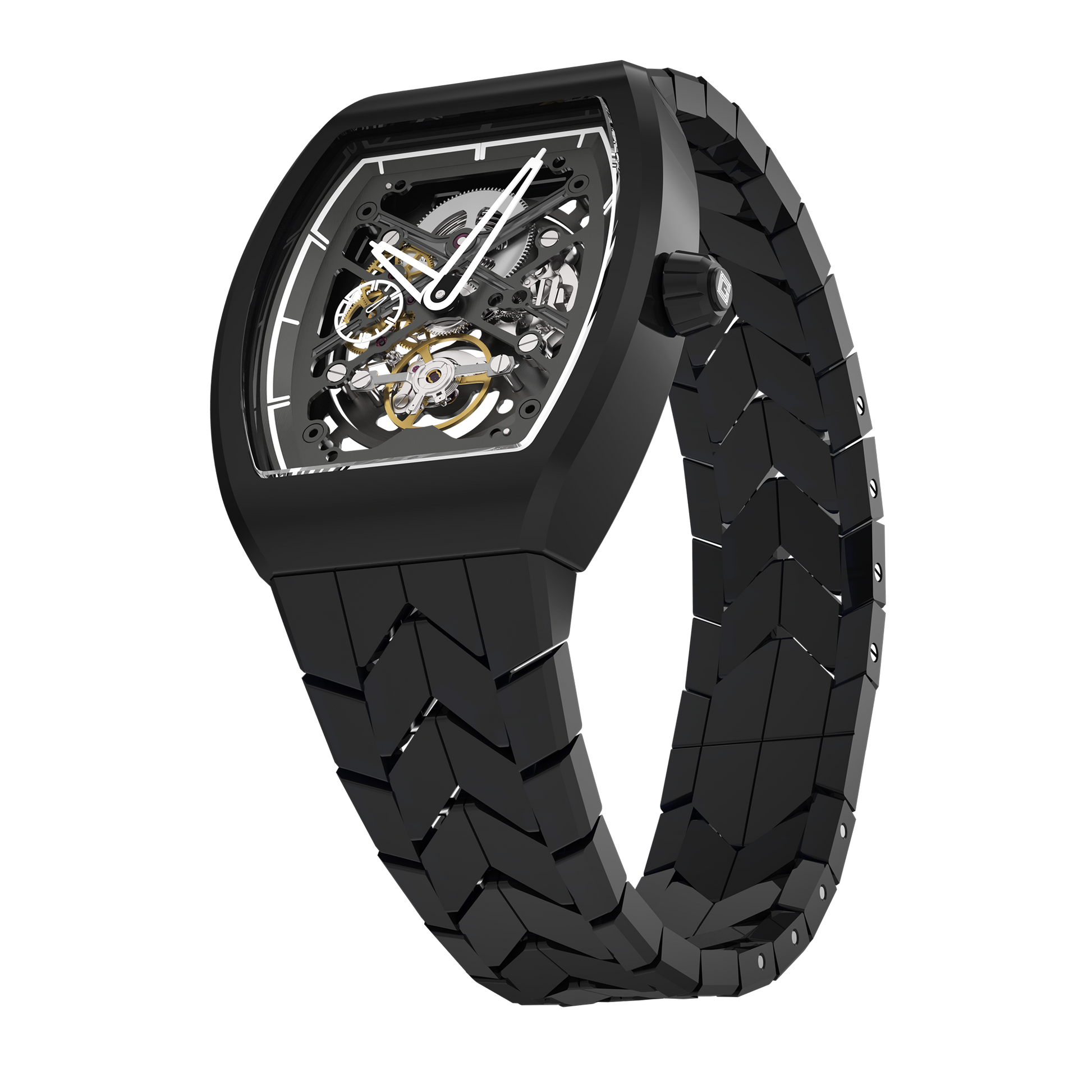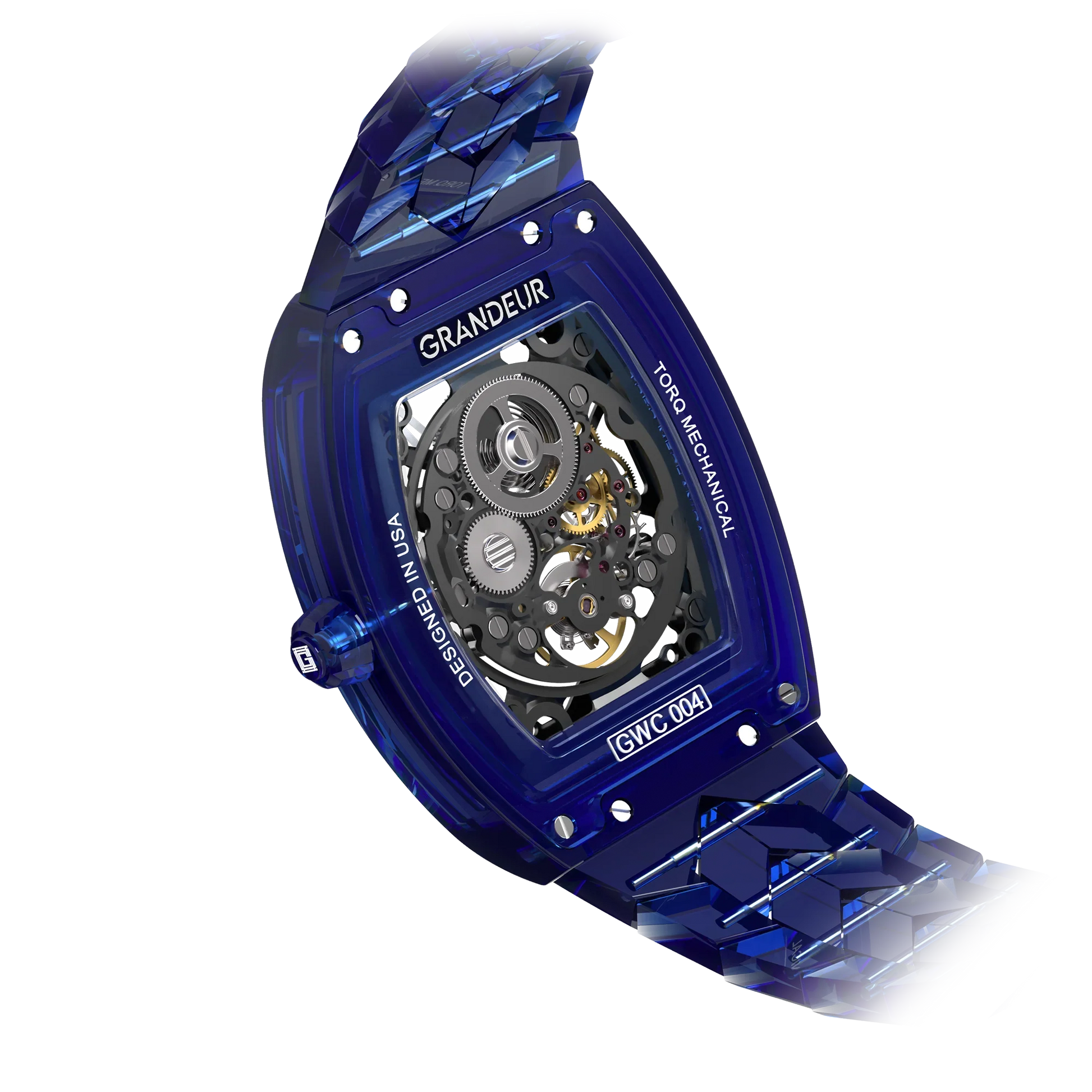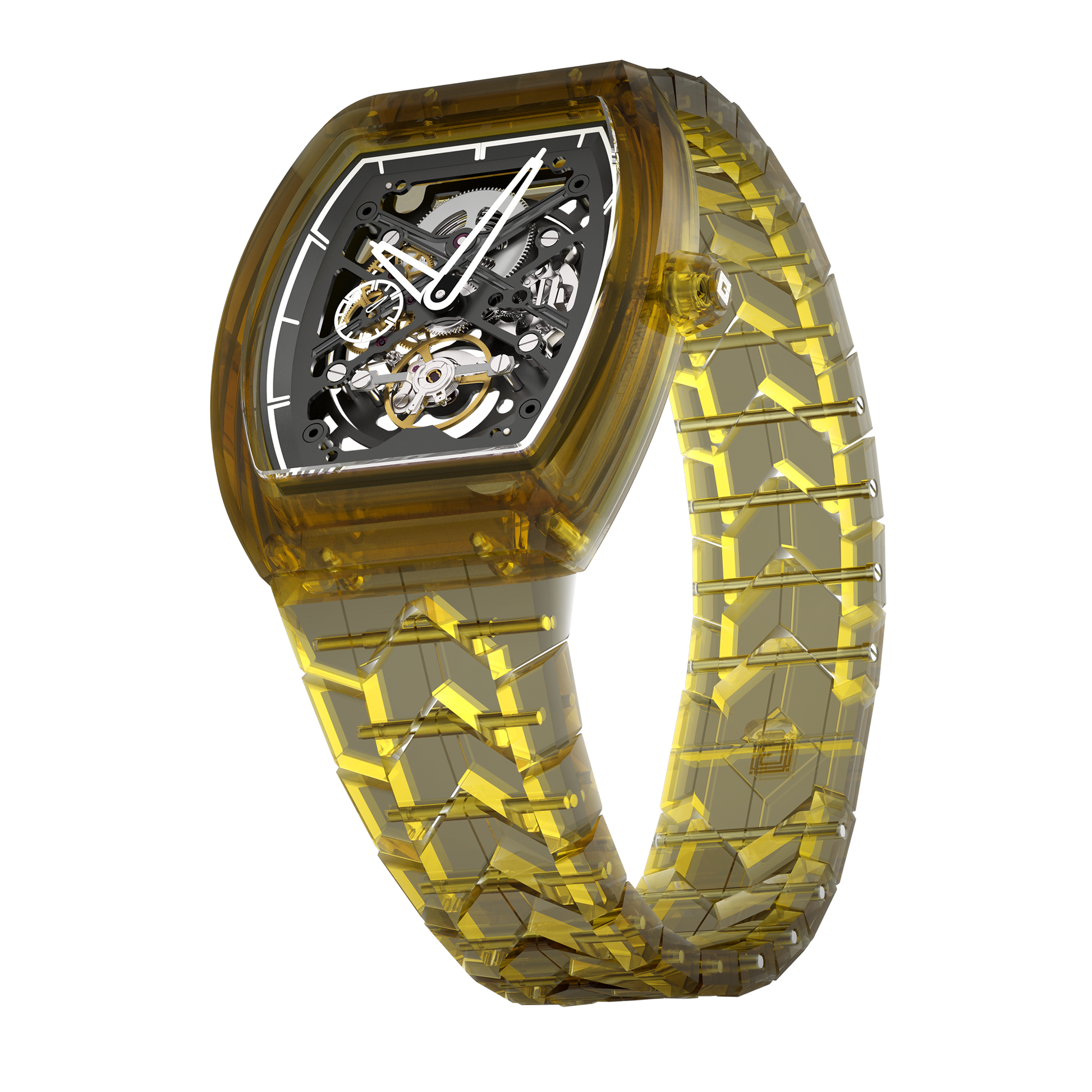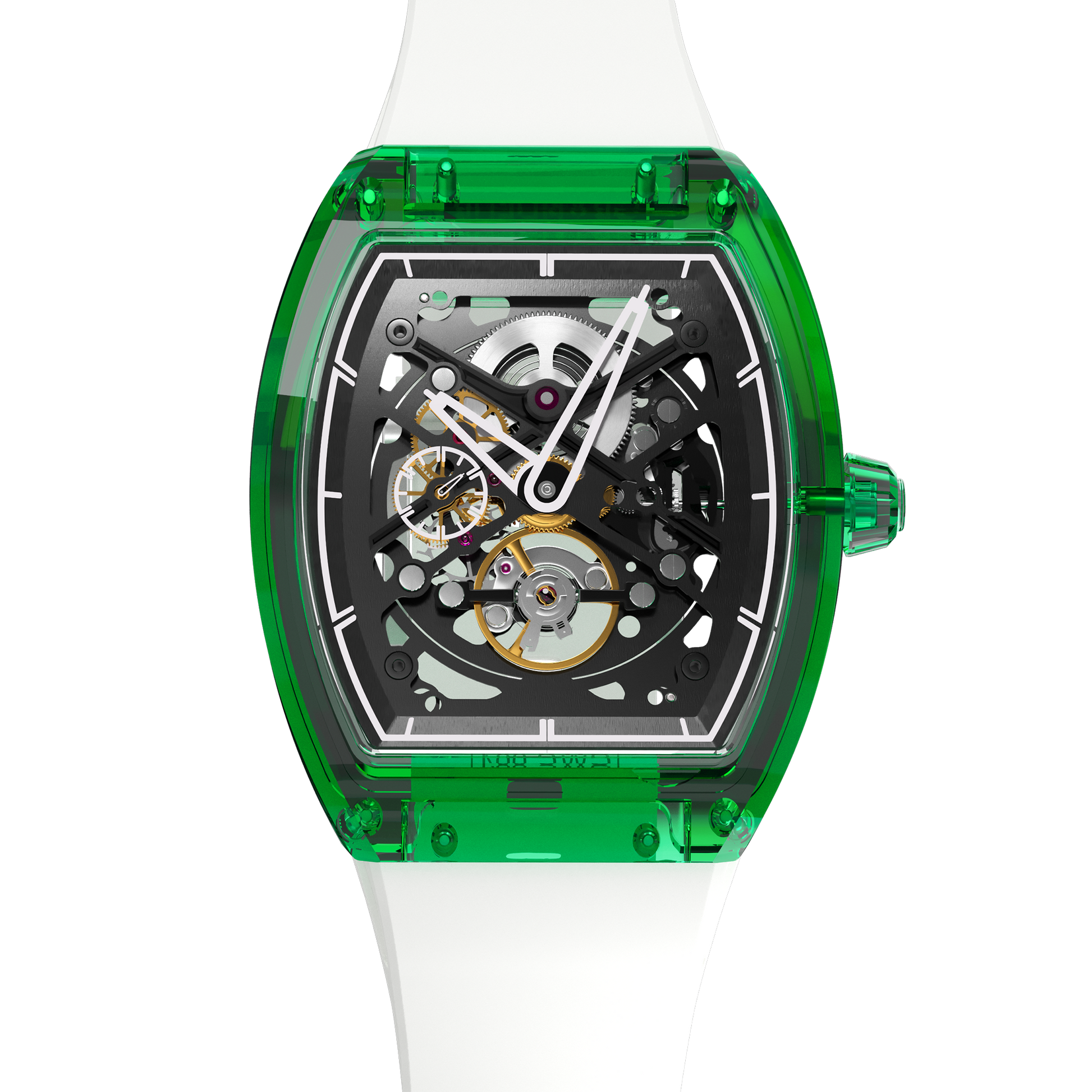 Le saphir est un matériau très prisé — affichant une dureté proche de celle du diamant (9 sur l’échelle de Mohs), une sensation de verre au toucher et une apparence semi-transparente. Nous le proposons en six déclinaisons de couleur, chacune disponible avec bracelet assorti ou sur strap.
